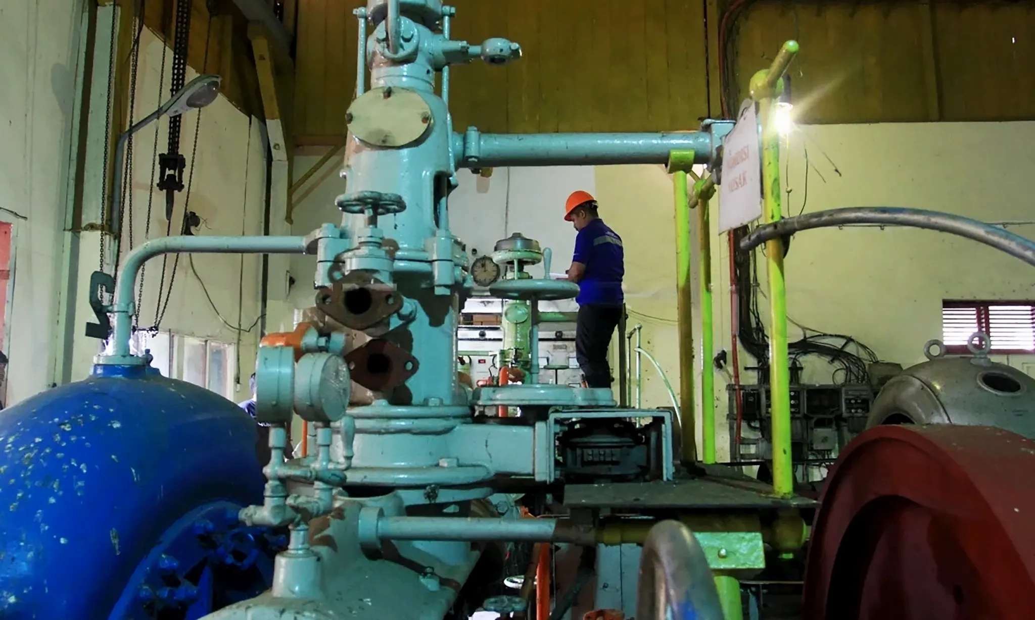 Petugas memeriksa mesin dalam ruang generator di PLTA Rasak Bungo, Padang, Sumatra Barat, Sabtu (18 /2/2023). Antara Foto/Muhammad Arif Pribadi