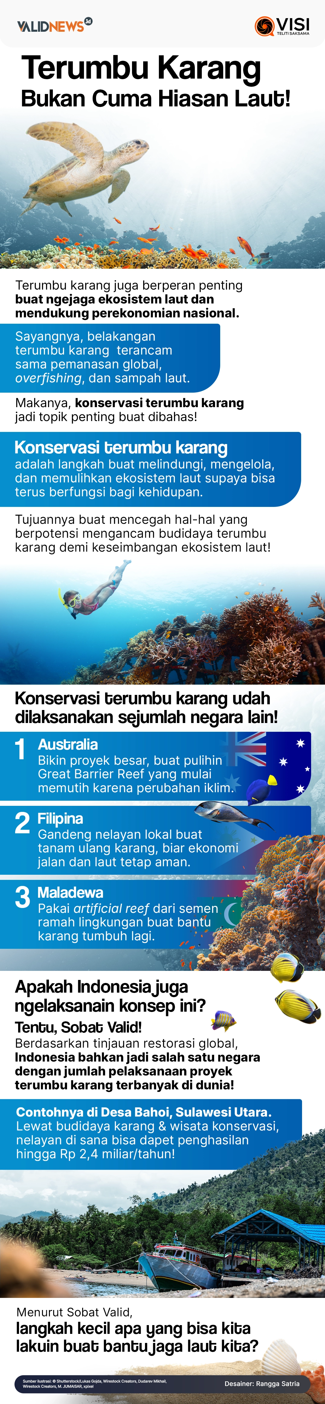 Konservasi terumbu karang menjadi agenda penting Indonesia. Pasalnya, tak cuma hiasan laut, ekosistem ini juga memegang peranan penting dalam perekonomian Indonesia.