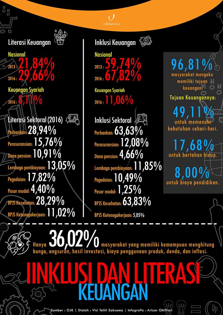 Angka ini cukup timpang dibandingkan tingkat literasi maupun inklusi keuangan konvensional. Masih berdasarkan data yang sama, tingkat literasi keuangan pada 2016 berada di angka 29,66%. Sementara itu, tingkat inklusi keuangan konvensional bertengger di angka 67,82%.