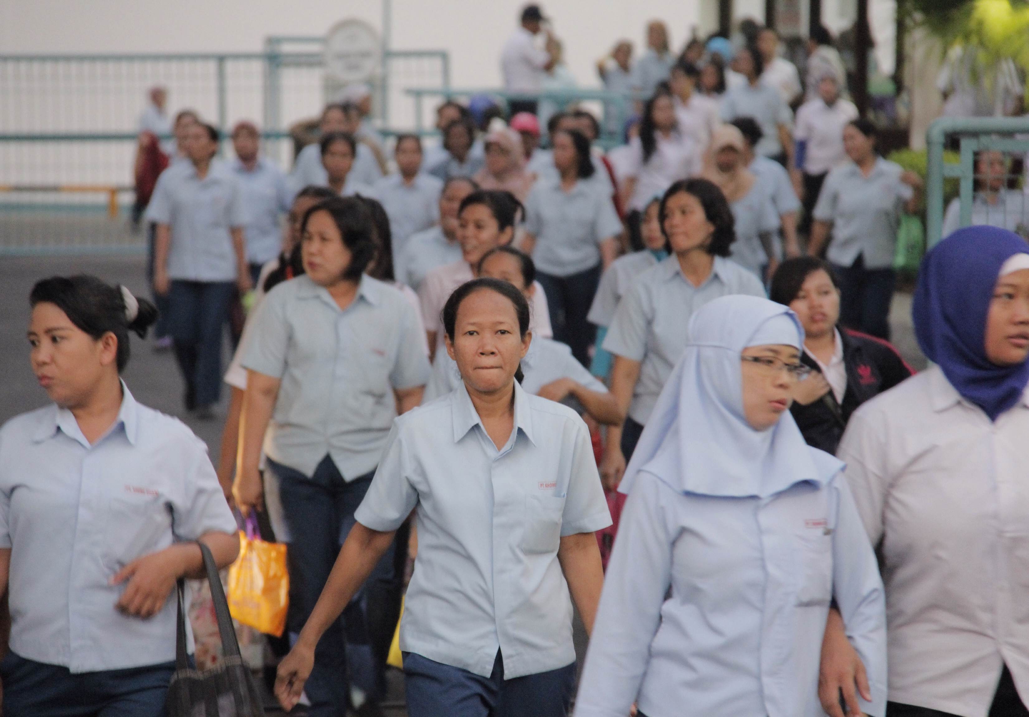 Sejumlah buruh pulang ke rumah usai bekerja di salah satu pabrik di kawasan Jakarta Timur. Sejumlah buruh tetap bekerja meski isu Pemutusan Hubungan Kerja (PHK) massal terus mengahantui nasib mereka. Validnews/Agung Natanael.