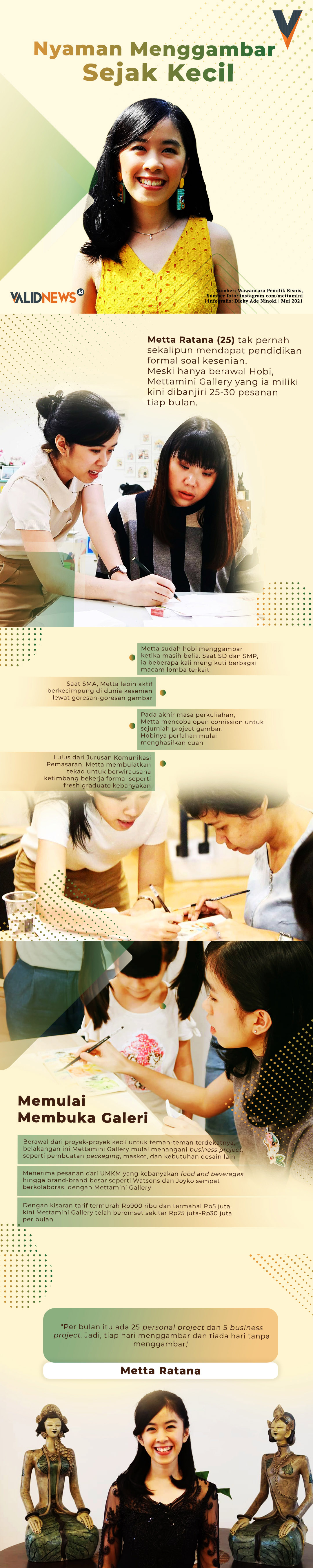 Namun, di balik semua kondisi itu, Metta Ratana (25) justru berhasil mendulang peruntungan dan penghidupan dari bakat melukisnya. Perempuan yang hobi menggambar sejak kecil ini mampu menarik minat banyak konsumen untuk menggunakan bakat dan jasa lukisnya, hingga bisnis ilustrasi kini menjadi pekerjaan utama Metta.