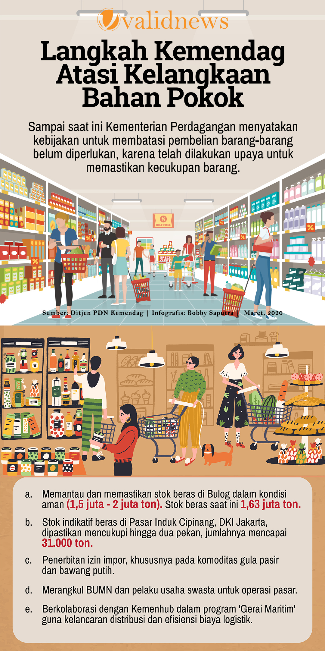 Ia menambahkan, tidak perlu adanya regulasi pembatasan pembelian karena sejauh ini, Kementerian Perdagangan telah berulang kali mengimbau kepada masyarakat agar tidak melancarkan aksi panic buying. Ia optimistis, masyarakat berbelanja sesuai kebutuhannya karena stok barang dipastikan cukup.