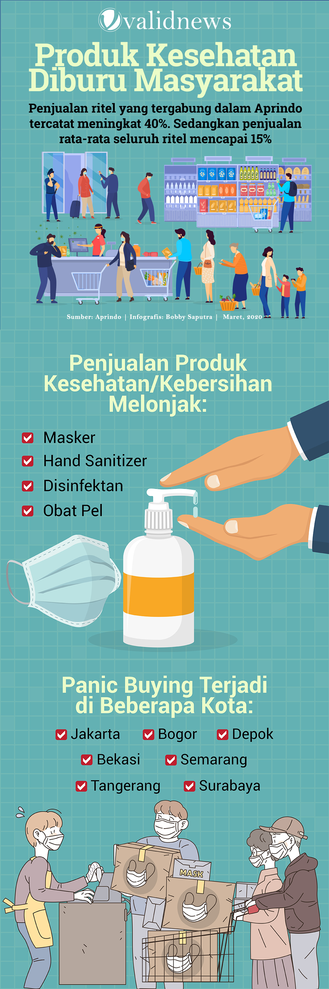 Asosiasi Pengusaha Ritel Indonesia (Aprindo) mencatat dari seluruh ritel yang terdaftar dalam organisasi itu, setidaknya peningkatan pembelian terjadi pada barang-barang terkait kesehatan dan higienitas, seperti masker, hand sanitizer, desinfektan untuk obat lantai, dan lain-lain.