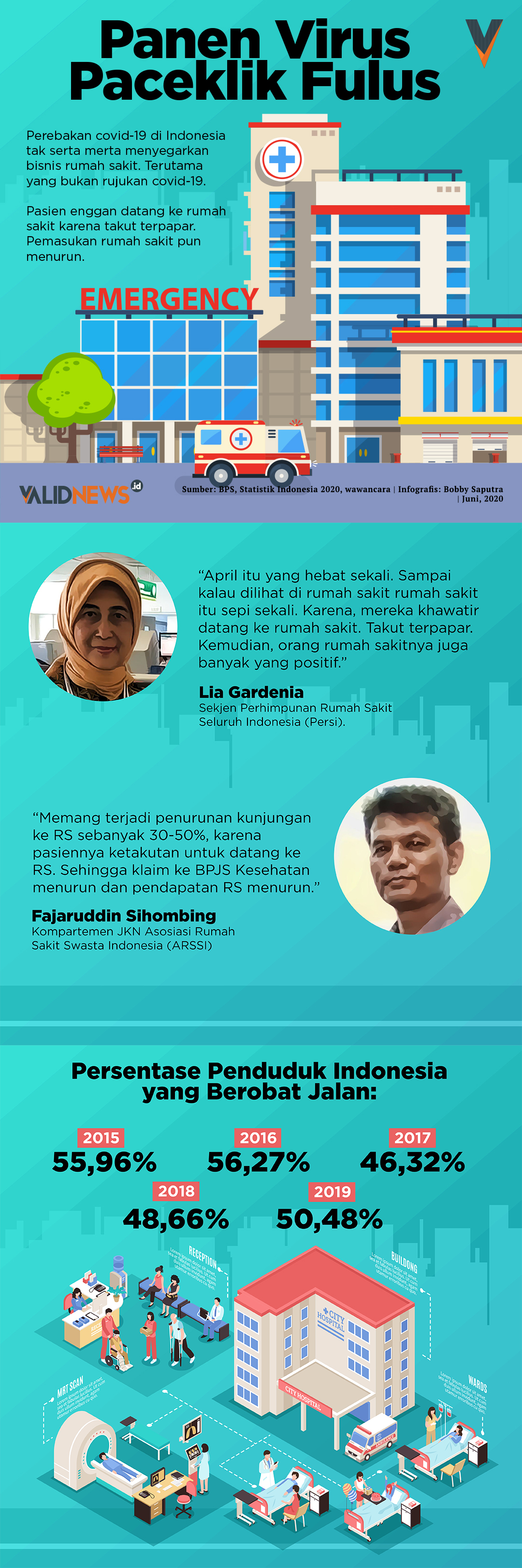 Penurunan jumlah pasien di berbagai fasilitas kesehatan di Indonesia, dibenarkan oleh Sekretaris Jenderal Perhimpunan Rumah Sakit Seluruh Indonesia (Persi) Lia Gardenia Partakusuma. Melalui sambungan telepon, Lia menyebut, jumlah kunjungan pasien di hampir seluruh rumah sakit di Indonesia mengalami penurunan drastis.