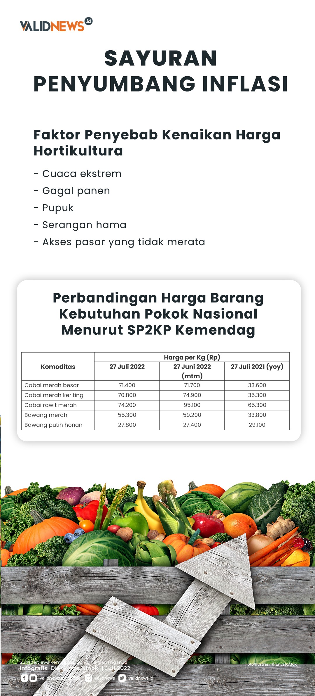 BPS dalam Statistik Hortikultura 2021 menyebutkan terdapat komoditas sayuran yang memiliki kontribusi besar pada produksi hortikultura, di saat yang sama punya sumbangan besar pada inflasi. Jenis sayuran itu adalah bawang merah, bawang putih, cabai besar, cabai rawit, kentang, tomat dan wortel.