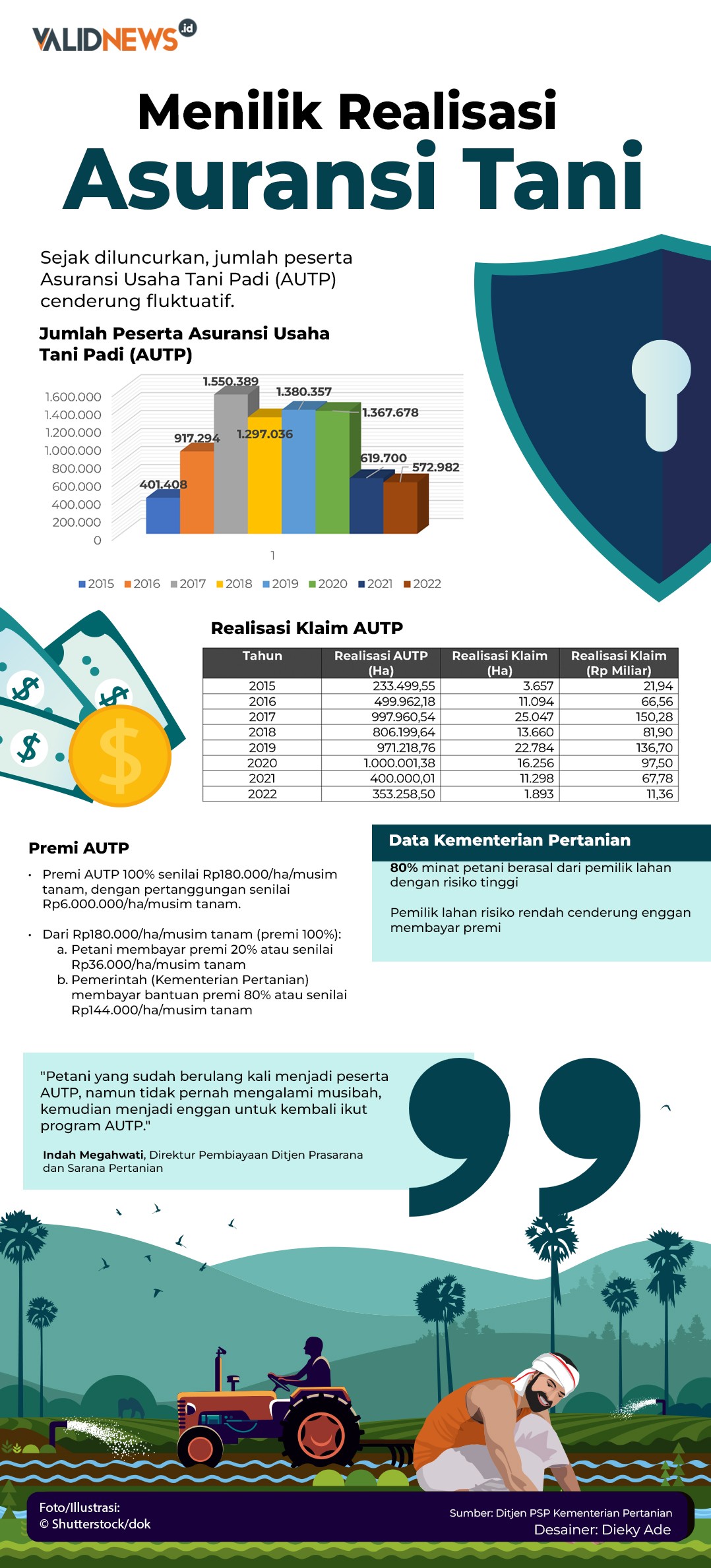 Sayangnya, dalam catatan Ditjen PSP Kementan, jumlah petani yang ikut pada program AUTP pada 2022 lalu hanya sebesar 572.982 orang. Angka itu menurun dibandingkan tahun 2021 sebanyak 619.700 orang dan tahun 2020 sekitar 1,36 juta petani.
