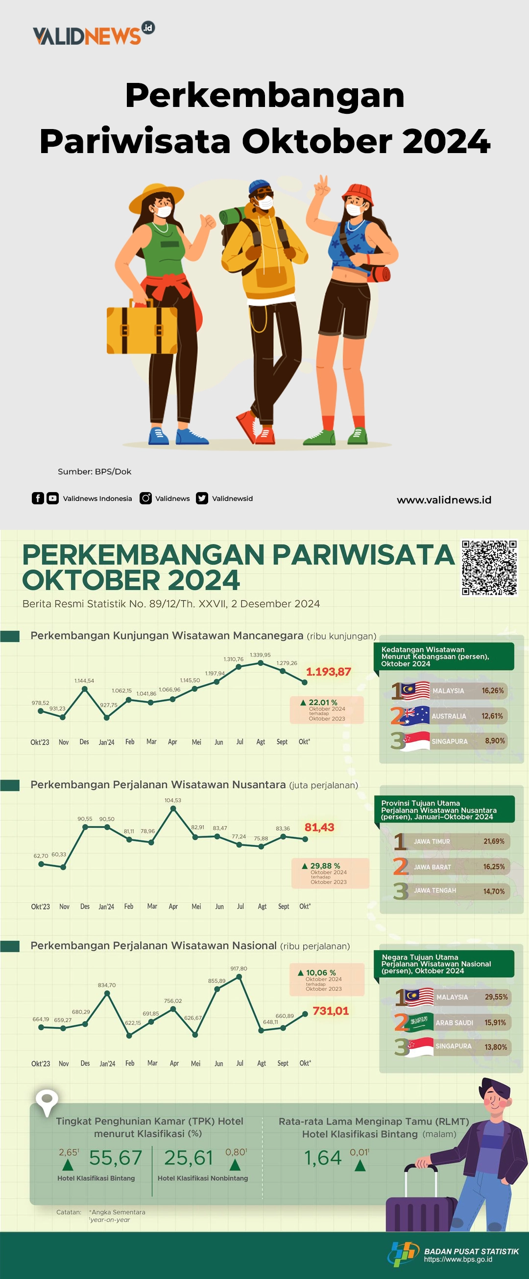 Jumlah pergerakan wisatawan nusantara sepanjang Oktober 2024 hanya sebesar 81,43 juta perjalanan. Total pergerakan wisnus Januari-Oktober 2024 sudah jauh lebih baik dibanding periode sebelum pandemi.