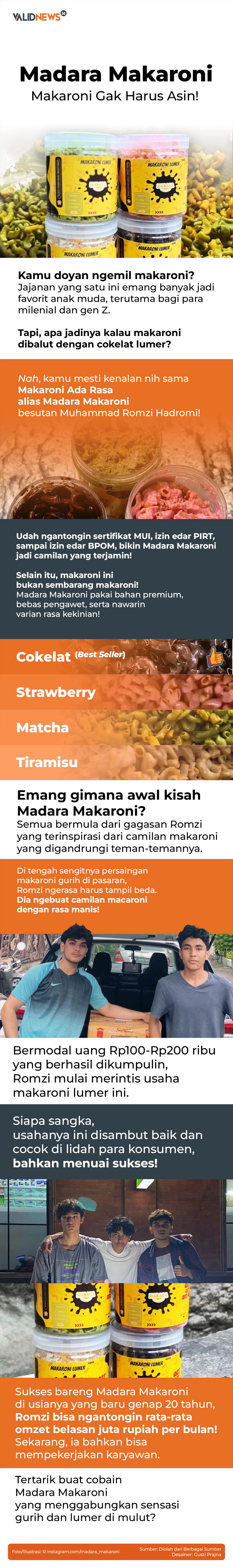 "Ini makaroni kan makanannya udah original ya, kalau mentahannya tuh enggak ada rasa manis, enggak ada rasa asin, jadi cocok kayak dibikin rasa-rasa manis. Nah, saya melihat peluang di situ... kayak wah coba deh kalau makaroni kita bikin varian manis," terang dia.
