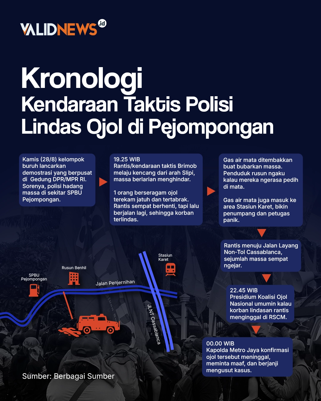 Adapun video kejadian rantis Barracuda Brimob melindas pengendara ojek online (ojol) tersebar di berbagai platform media sosial (medsos) masyarakat, yang diperkirakan berlokasi di Pejompongan.