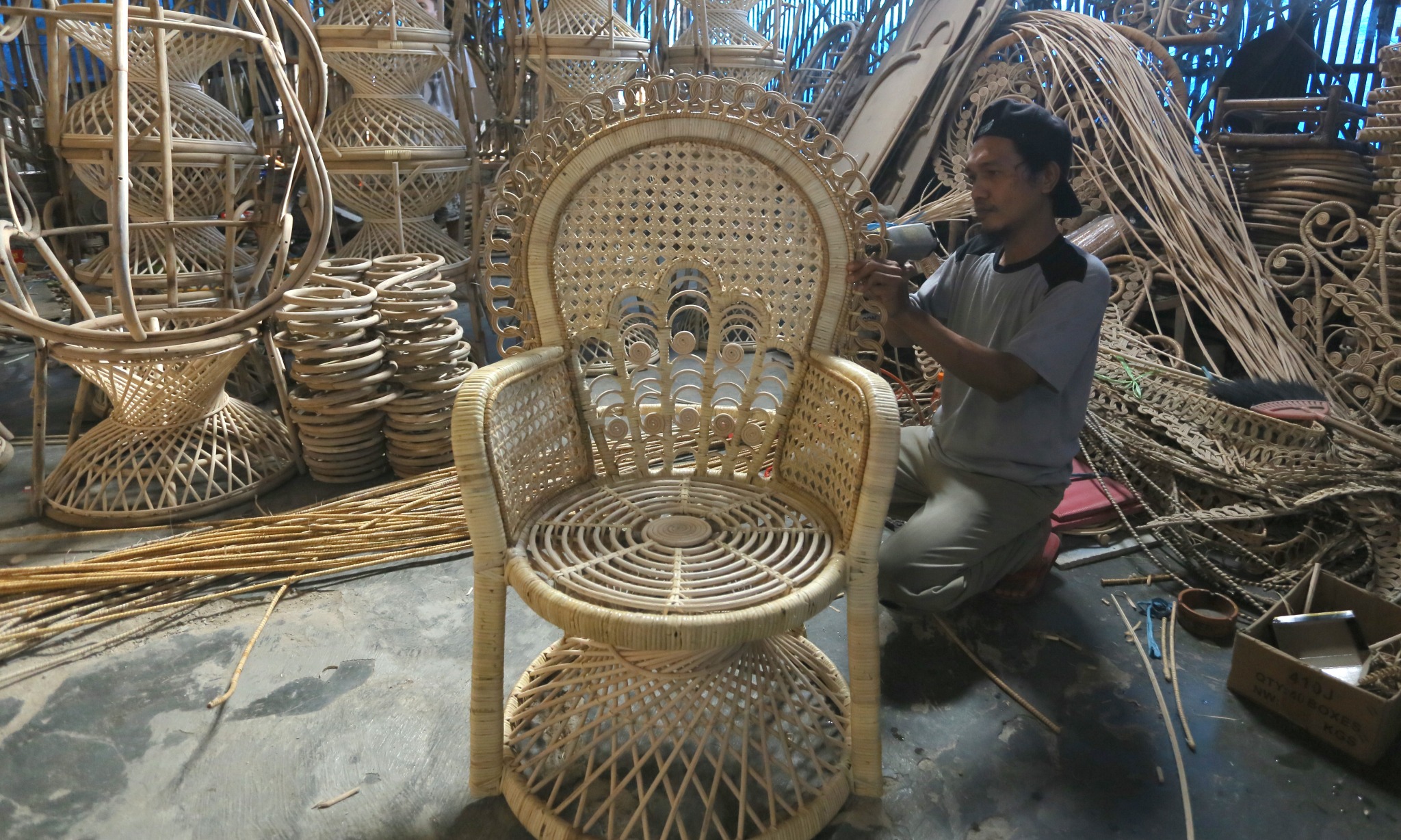 Perajin menyelesaikan pembuatan kursi rotan di Desa Bodesari, Plumbon, Kabupaten Cirebon, Jawa Barat , Kamis (21/10/2021). ANTARA FOTO/Dedhez Anggara