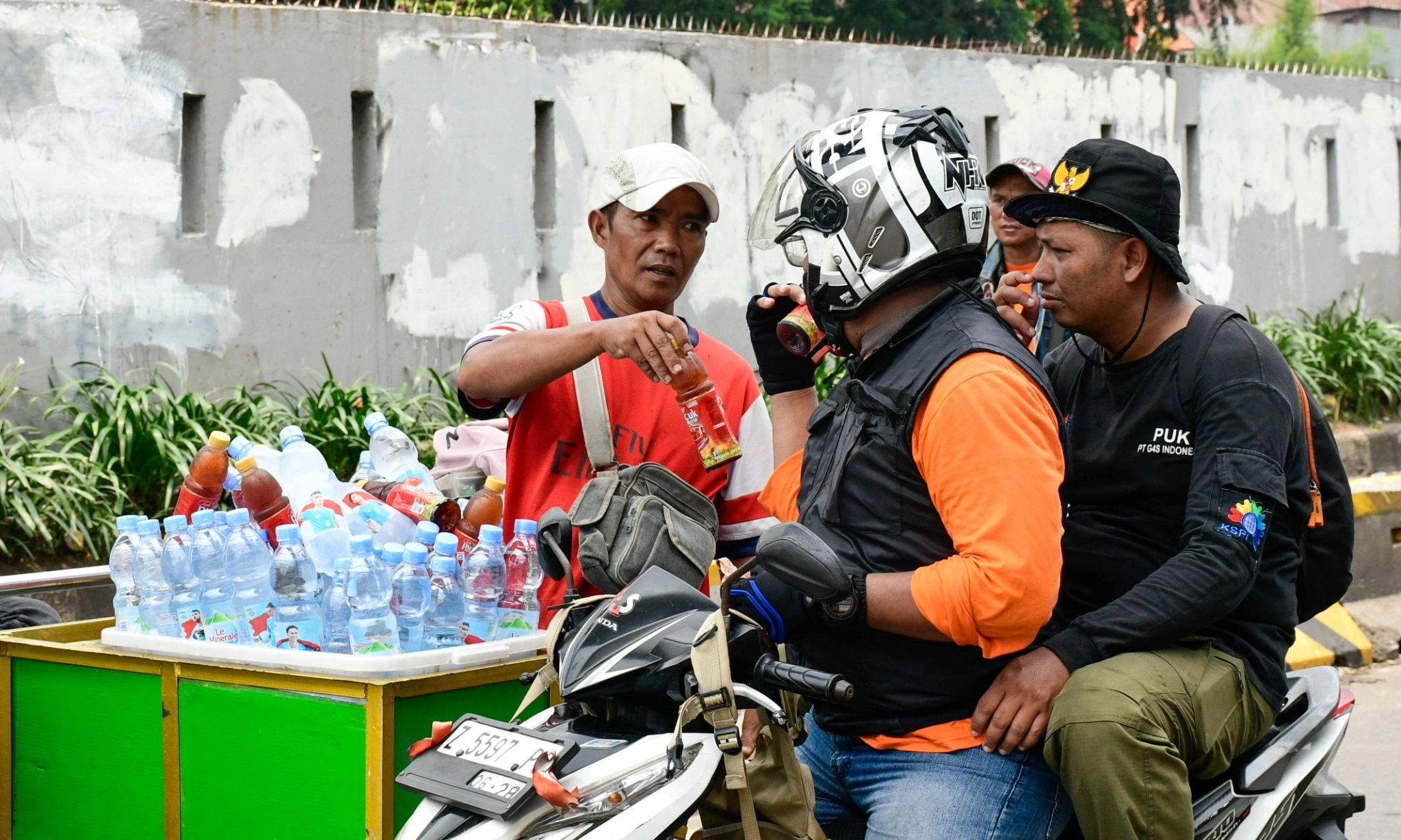 Seorang pedagang minuman melayani dua orang peserta aksi yang berhenti dengan sepeda motor di depan Gedung DPR, Jakarta (28/08/2025). Validnews/Hasta Adhistra.