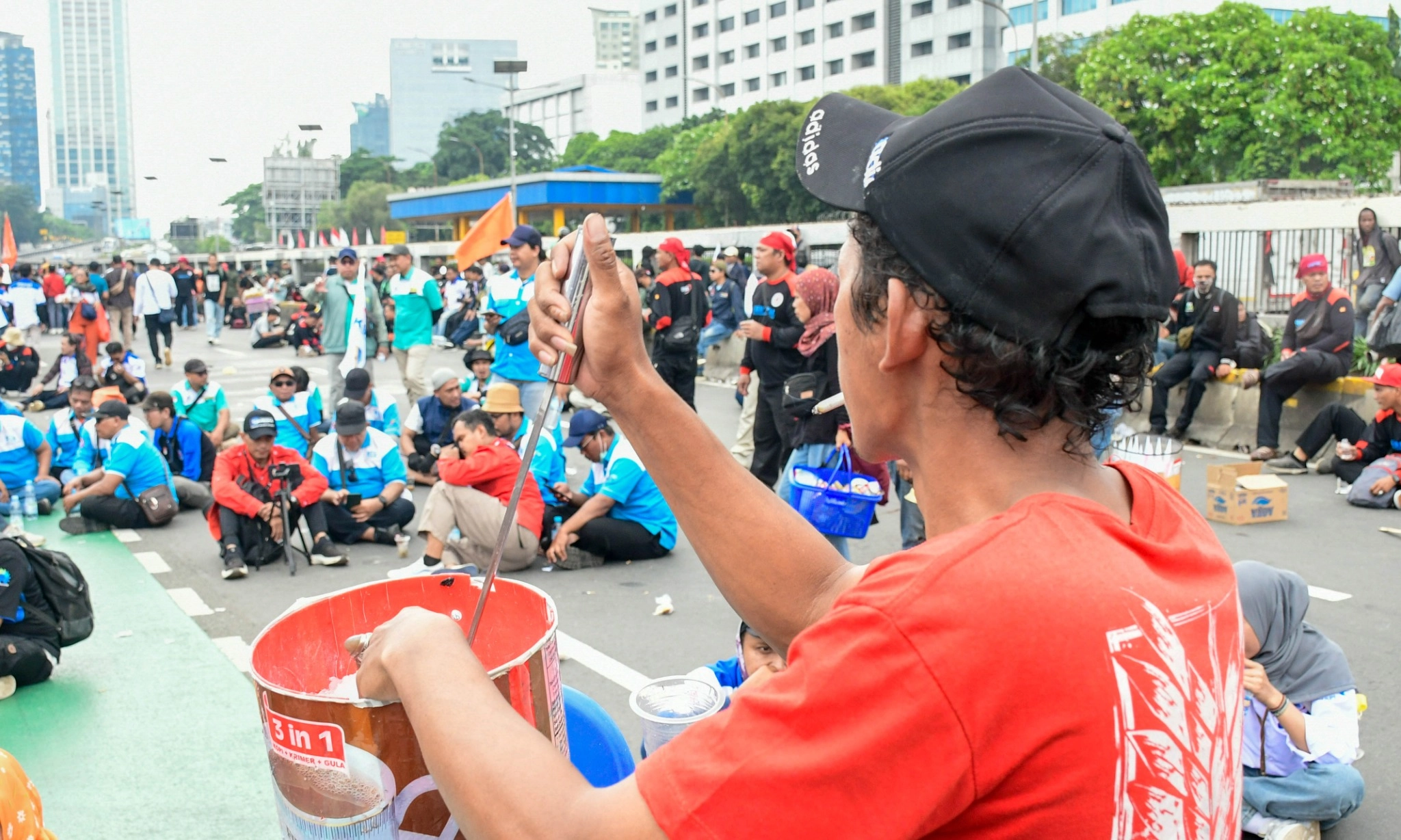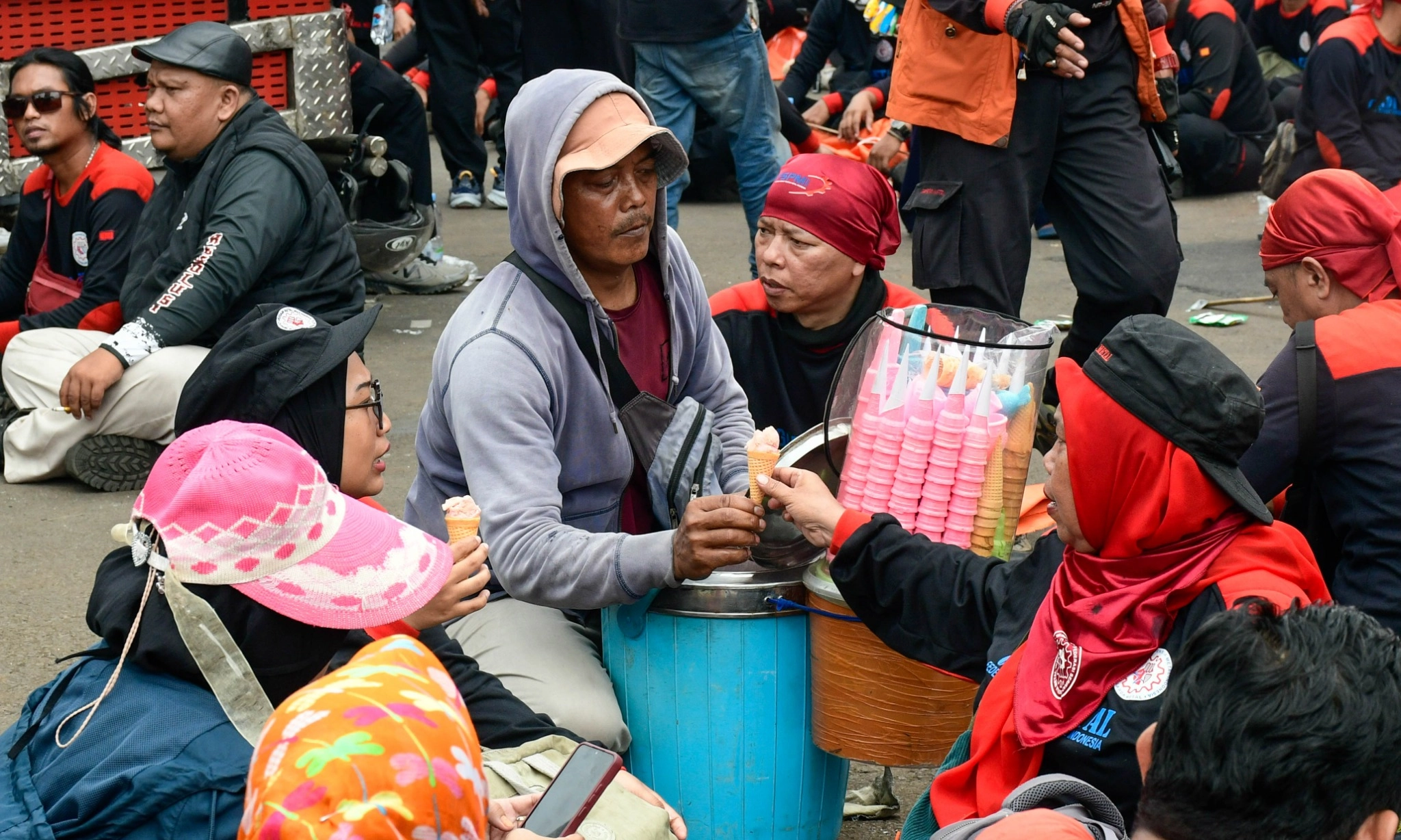 Berbagai dagangan dijajakan di tengah kerumunan demonstran—dari minuman segar, makanan, potongan buah, hingga es krim—seakan menjadi penawar panas di tengah kepala yang terasa terbakar.