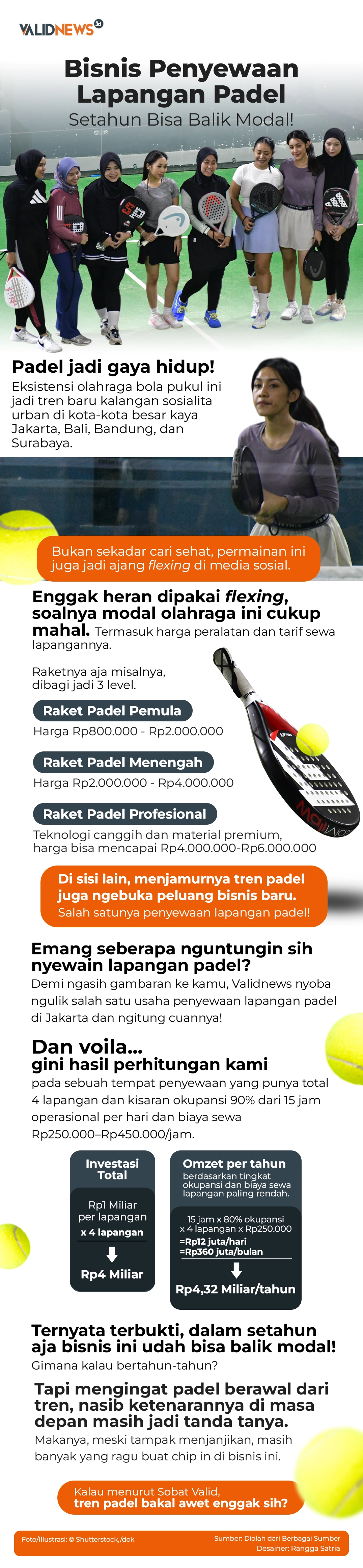 Berdasarkan hitungan kasar Validnews, jika lapangan padel yang dikelola Yudhi beroperasi selama 15 jam mulai pukul 07.00 pagi hingga 22.00 malam setiap harinya, dengan mempertimbangkan okupansi 80% dari sebanyak lima lapangan yang ada, maka dalam satu hari bisa saja pengelola mengantongi pendapatan kotor hingga Rp24 juta. Angka itu diperoleh dengan dikalikan biaya sewa terendah di kisaran Rp400 ribu.