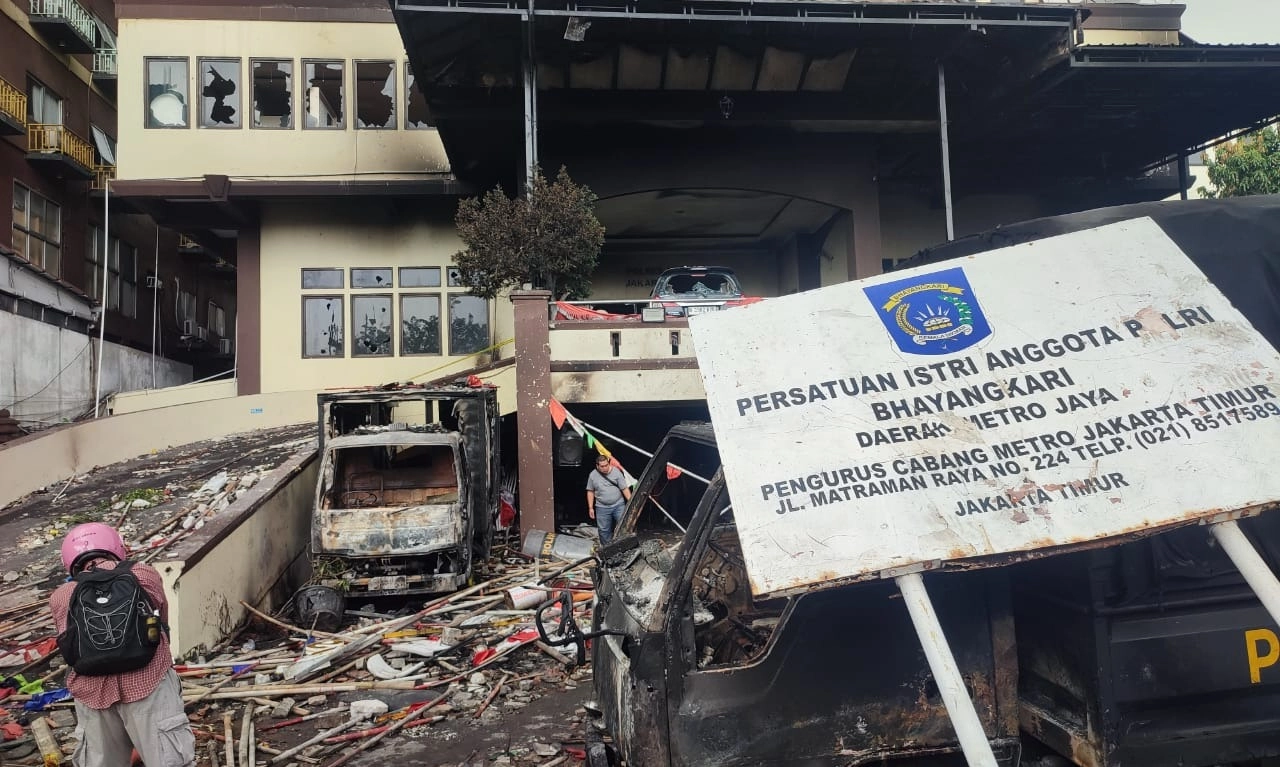 Kondisi pasca aksi di depan gedung Polres Metro Jakarta Timur, Jatinegara, Sabtu (30/8). ValidnewsID/Agung M FatwaSementara ini, pihaknya telah mengidentifikasi sebanyak 42 bangunan gedung dan 32 pos polisi yang mengalami kerusakan di 29 kota pada 12 provinsi. Data ini masih berpotensi terus bertambah dan akan difinalisasi terus sesuai perkembangan di lapangan.