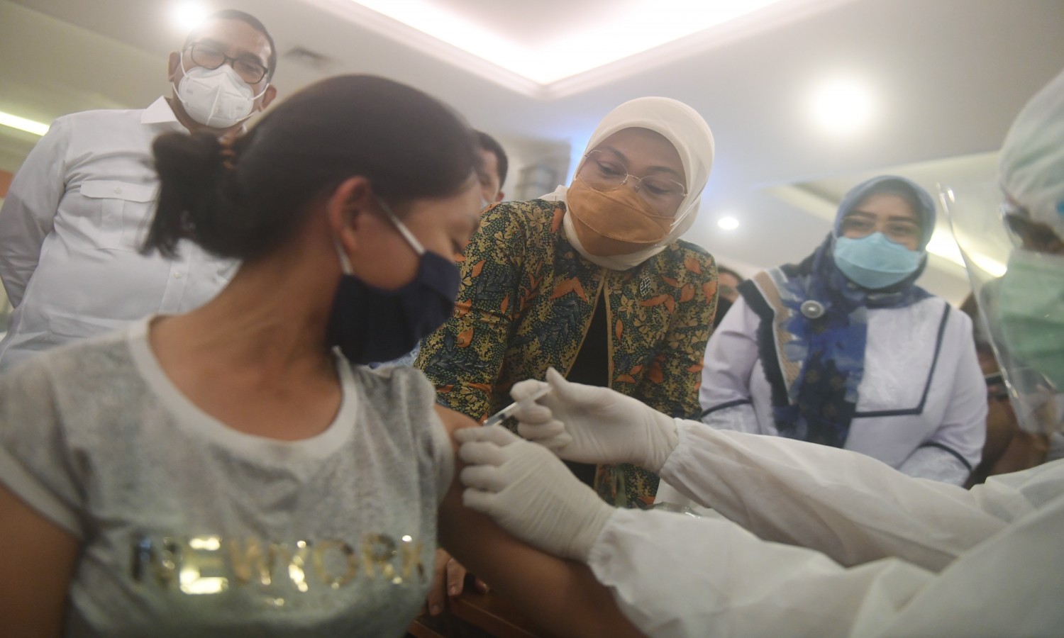 Menteri Ketenagakerjaan Ida Fauziyah (tengah) menyaksikan vaksinasi buruh di Jakarta, Selasa (4/5/20 21). ANTARA FOTO/Akbar Nugroho Gumay