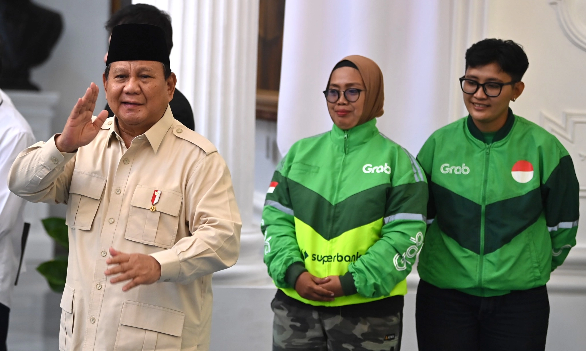 Presiden Prabowo Subianto (kiri) menyapa wartawan seusai menyampaikan keterangan terkait pemberian t unjangan hari raya (THR) kepada pengemudi ojek daring di Istana Merdeka, Jakarta, Senin (10/3/2025). Antara Foto/ Aditya Pradana Putra