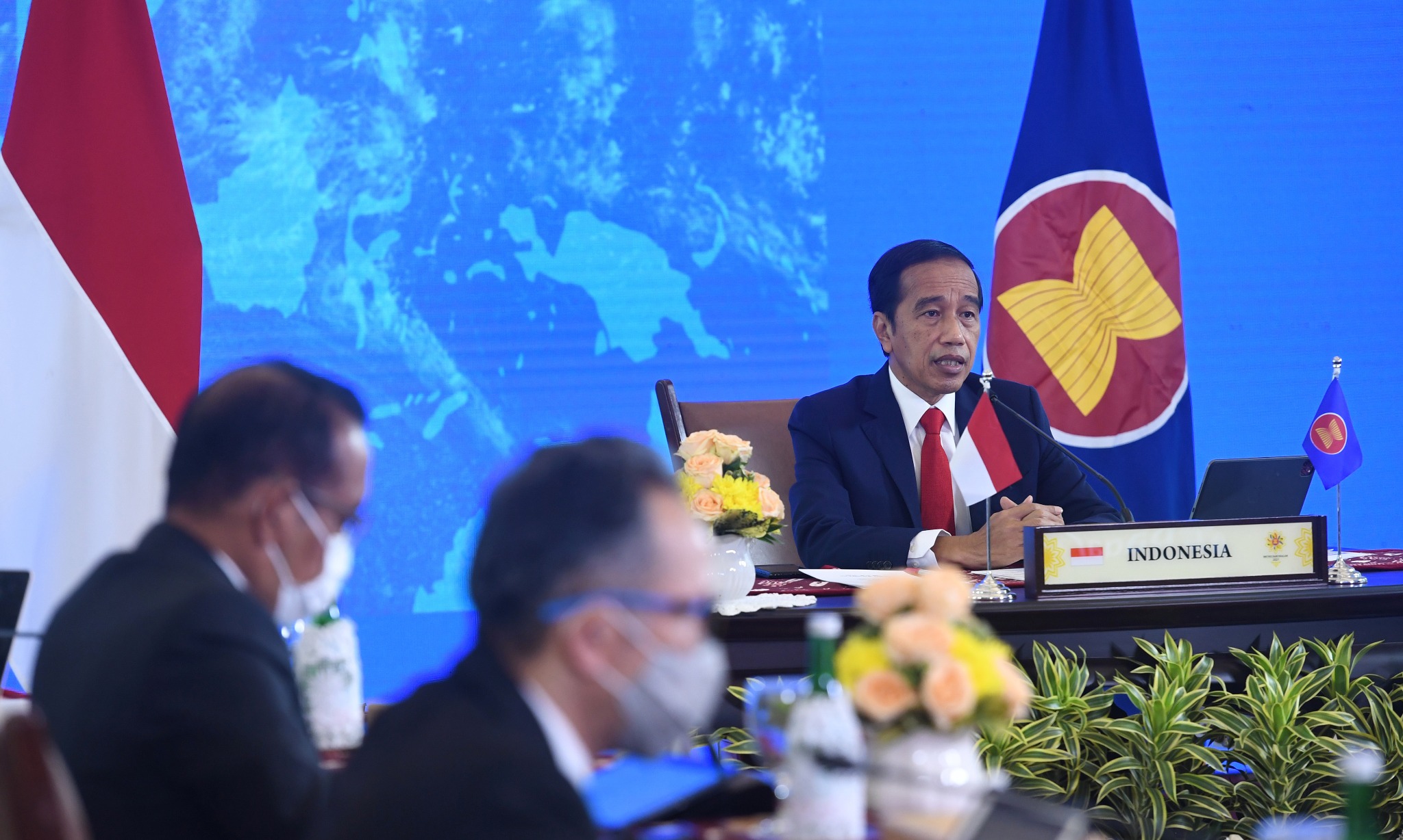 Presiden Joko Widodo menghadiri KTT ASEAN ke-38 dan 39 secara dalam jaringan di Istana Kepresidenan, Bogor, Jawa Barat, Selasa (26/10/2021). ANTARAFOTO/Biro Pers dan Media Kepresidenan/Lukas