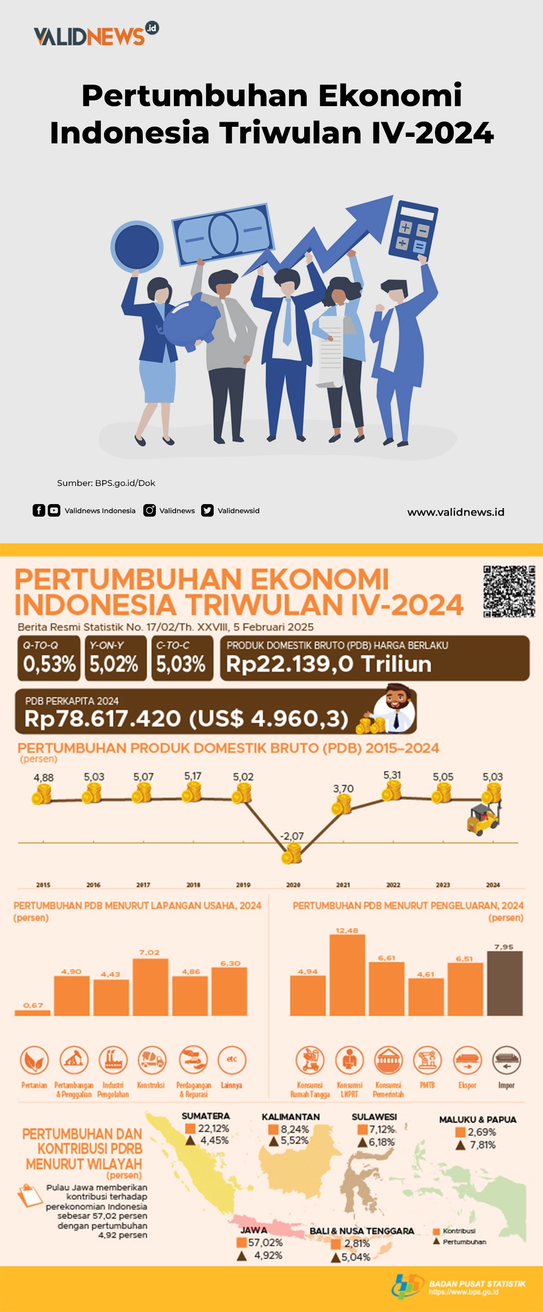 BPS melaporkan, ekonomi Indonesia tumbuh sebesar 5,02% secara tahunan (yoy) pada kuartal IV/2024. Capaian ini lebih tinggi daripada kuartal sebelumnya yang mencapai 4,95% (yoy).