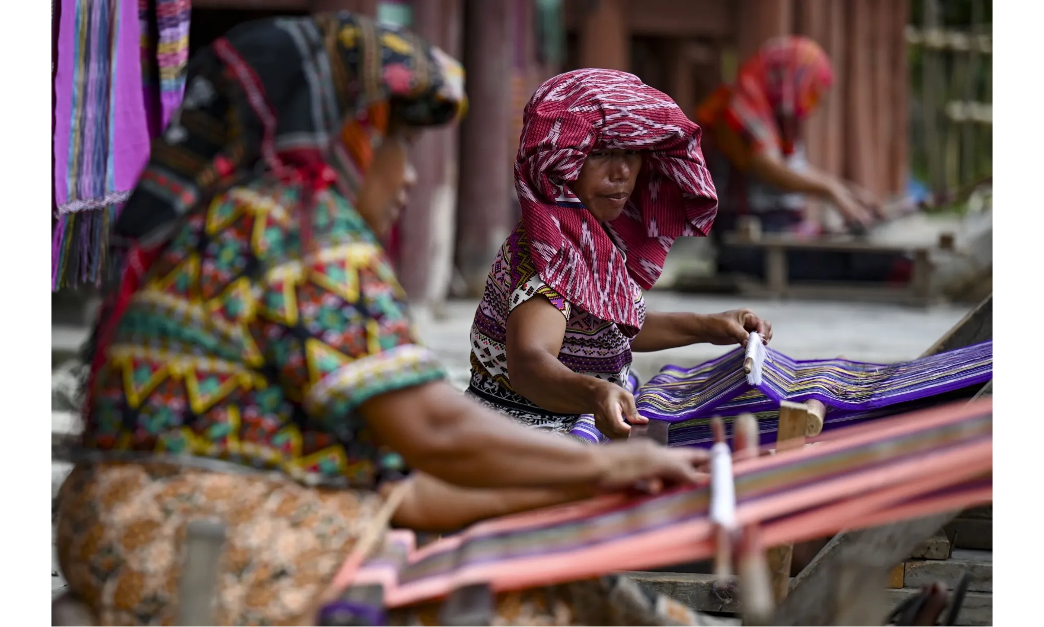 Sejumlah perajin menenun ulos di Desa Meat, Toba, Sumatera Utara, Rabu (28/2/2024). Antara Foto/Erlangga Bregas Prakoso