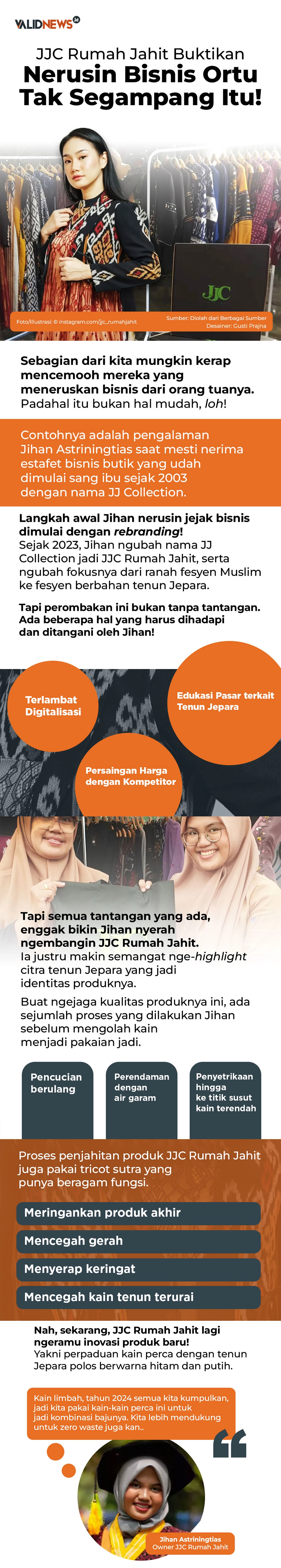 "Akhirnya, ibu seperti 'ya sudah ini nantinya juga kamu yang pegang'. Dengan usaha ini, aku buat JJC Rumah Jahit karena waktu kita daftarkan ke HAKI, nama JJ Collection itu sudah ada yang punya," imbuhnya.
