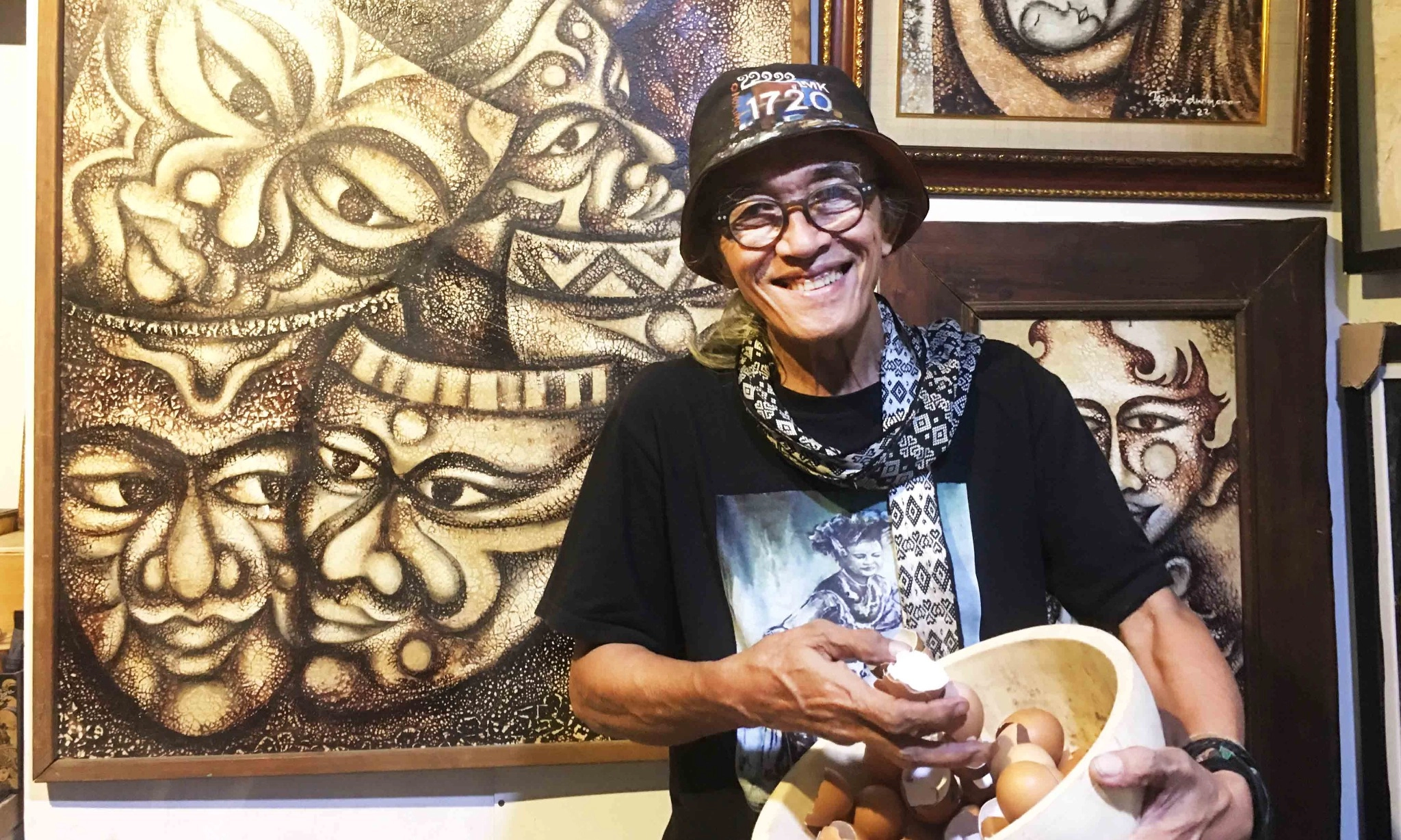 “Seperti inilah kehidupan saya sehari-hari, ditemani kulit telur dan sampah plastik,” kata sang pemilik galeri, Teguh Joko Dwiyono pada Sabtu (28/9).