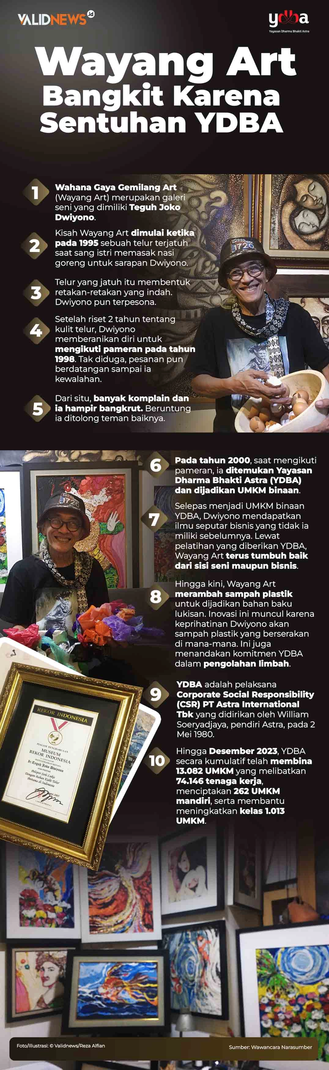 Produk dan lukisan kulit telur Teguh Joko Dwiyono sempat booming pada 1998. Pesanan berdatangan dan membuat kewalahan. Terpuruk sebelum akhirnya dibina YDBA pada 2000 dan bangkit kembali.