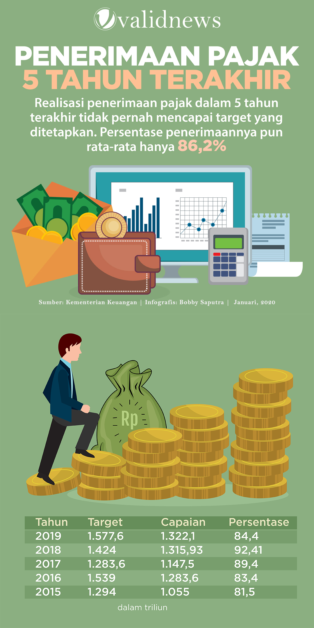 Dalam lima tahun terakhir, tax ratio tercatat sebesar 10,37% pada 2016, lalu merosot ke level 9,89% pada 2017, naik tipis ke 10,24% pada 2018. Pada 2019 kembali turun ke posisi 9,76% lalu kembali merosot menjadi 8,33% pada 2020.