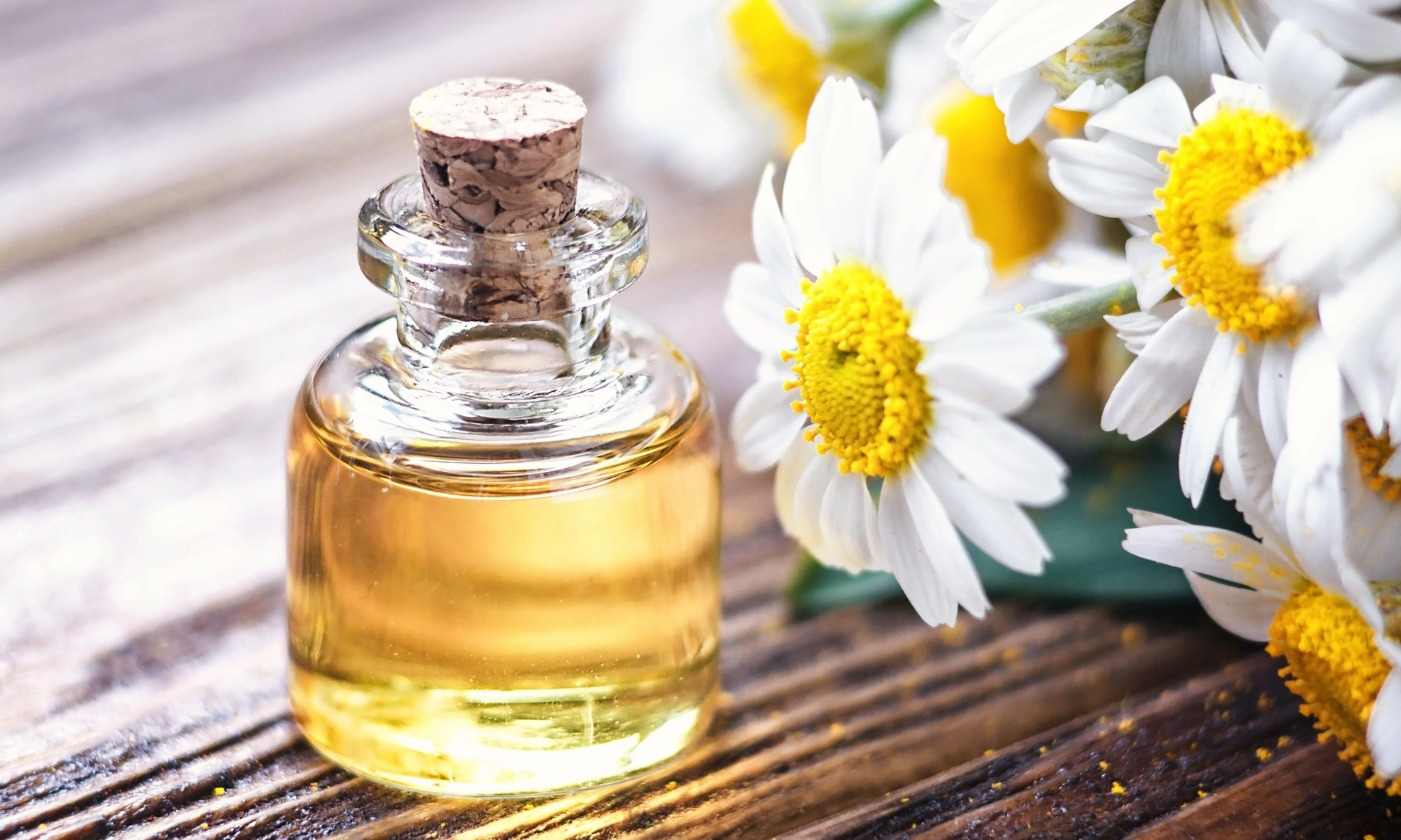 Ilustrasi - Minyak atsiri dalam botol kaca dengan bunga chamomile segar. Shutterstock/Bozhena Melnyk