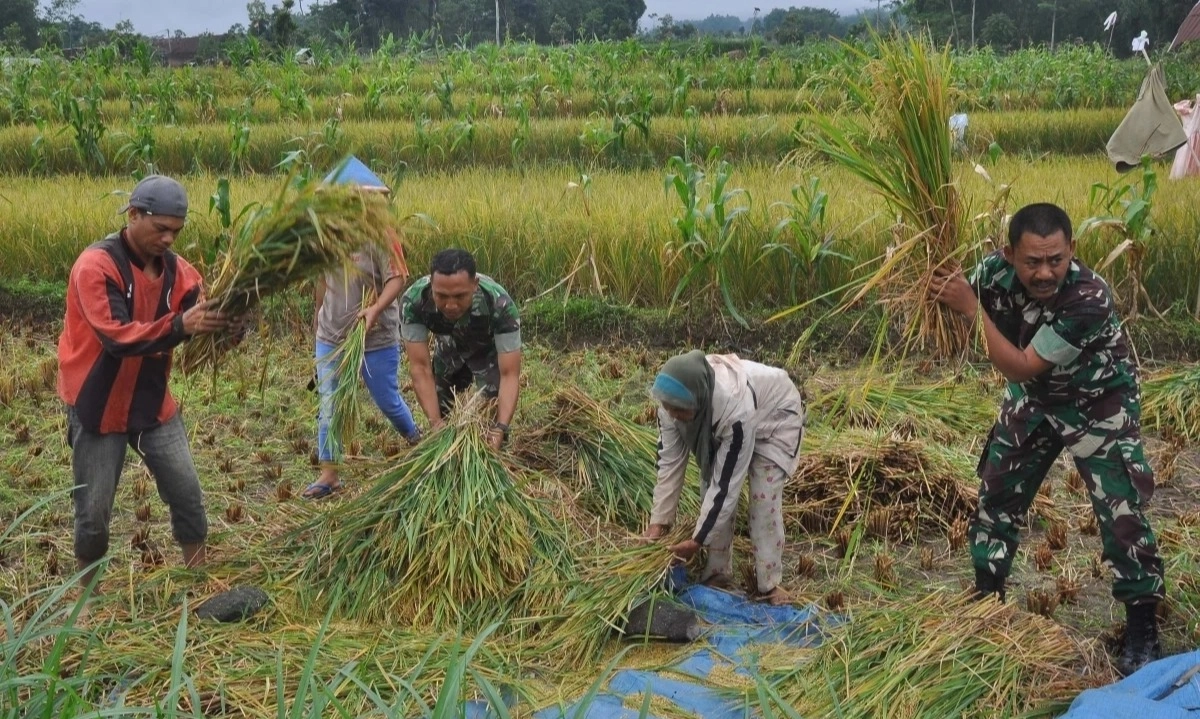 Sejumlah anggota Bintara Pembinaan Desa (Babinsa) membantu petani memanen padi di persawahan desa Ka ranggedong, Ngadirejo, Temanggung, Jateng, Kamis (28/12). Antara Foto/Anis Efizudin