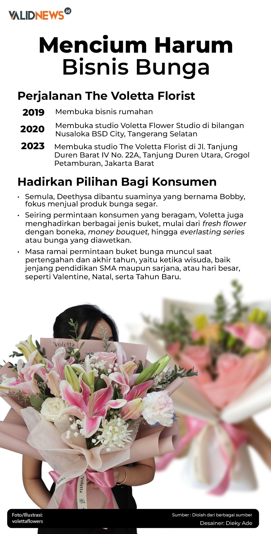 Saat Validnews mengunjungi outlet baru The Voleta Florist di bilangan Tanjung Duren, Thysa sapaan akrab Deethysa, bercerita soal ihwal bisnisnya. Ya, pemilik toko bunga ini sedari kuliah kurang tertarik dengan dunia perkantoran. Mengikuti nalurinya, dia sangat menikmati dunia bisnis.