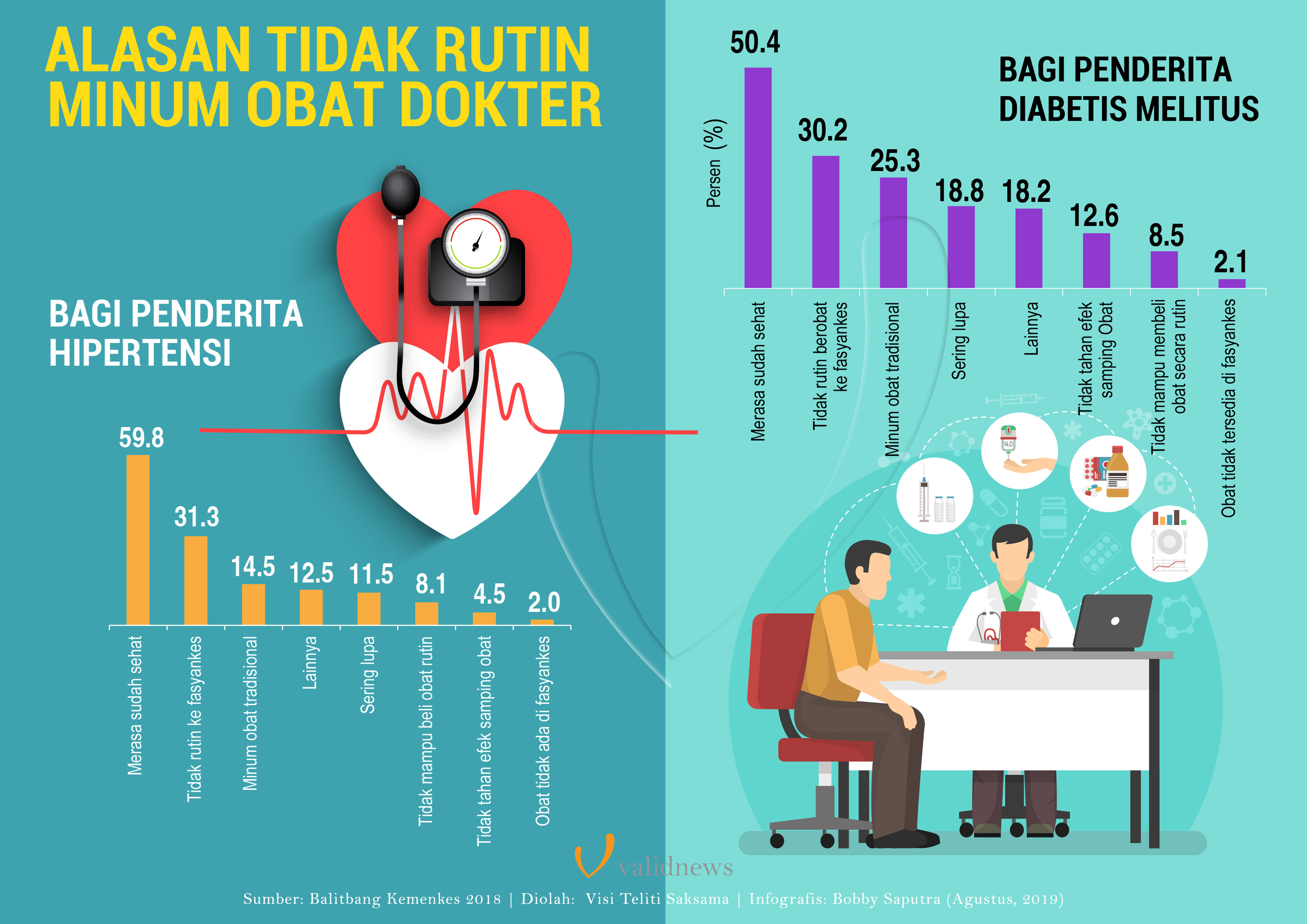 Di Tanah Air, ada lebih 63 juta warga mengidap hipertensi atau darah tinggi. Riset Kesehatan Dasar (Riskesdas) tahun 2018, dikutip dari Antara, mencatat jumlah warga dalam prosentase adalah sebesar 34,1 persen penduduk Indonesia. Dari populasi hipertensi tersebut, hanya sebesar 8,8 persen terdiagnosis hipertensi dan hanya 54,4 persen dari yang terdiagnosis hipertensi rutin minum obat.