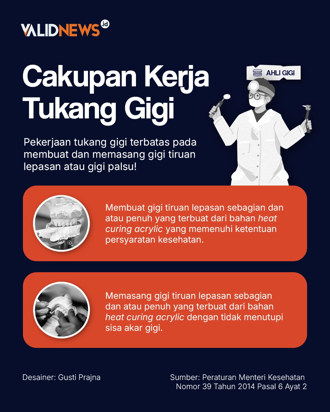 Tindakan medis tukang gigi pun dibatasi dan diatur pada Pasal 6 Ayat 2 Permenkes 39/2014. Di pasal ini, tukang gigi hanya boleh membuat gigi tiruan lepasan sebagian dan atau penuh yang terbuat dari bahan heat curing acrylic yang memenuhi ketentuan persyaratan kesehatan, dan memasang gigi tiruan lepasan sebagian dan atau penuh yang terbuat dari bahan heat curing acrylic dengan tidak menutupi sisa akar gigi.