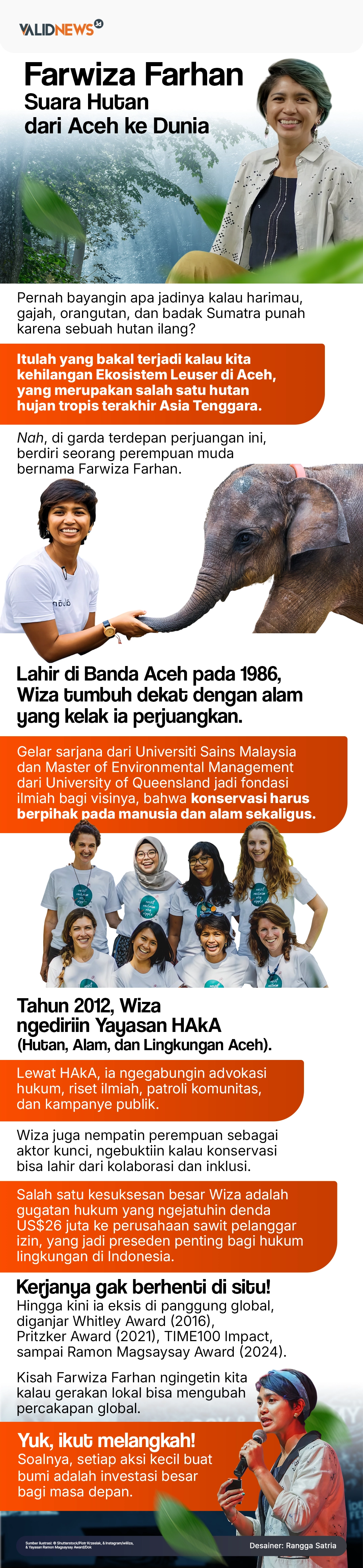 Nama Farwiza Farhan melekat dengan perjuangan perlindungan Leuser, ekosistem hutan hujan di Sumatra Utara dan Aceh. Dia menjadi simbol bagaimana kepedulian lokal, strategi hukum, dan pemberdayaan komunitas dapat mengubah nasib sebuah lanskap alam.
