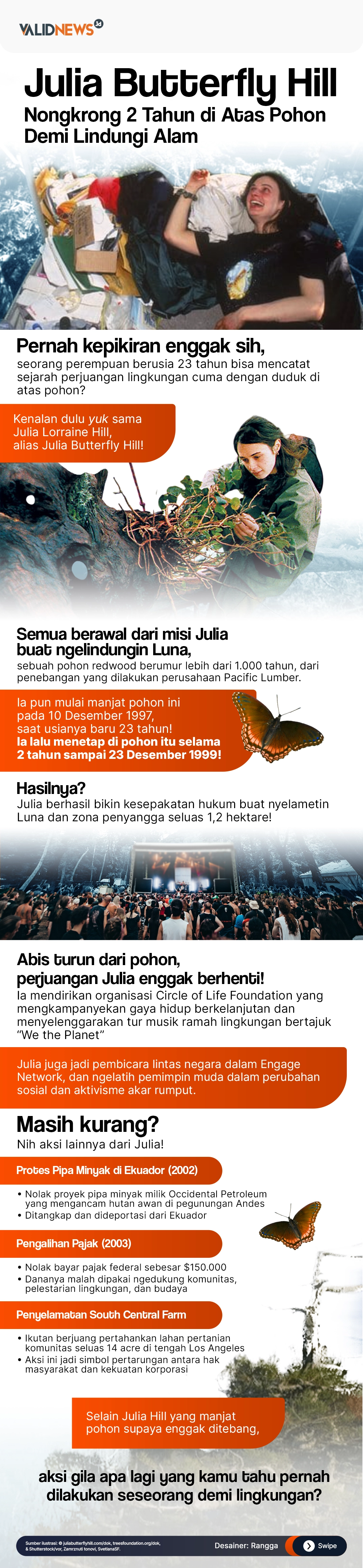 Apa yang dilakukan Julia 'Butterfly' Hill mungkin dianggap gila. Hidup di ketinggian pohon tua selama dua tahun demi mempertahankan kelangsungan ekosistem. Sebuah perlawanan yang tak biasa.