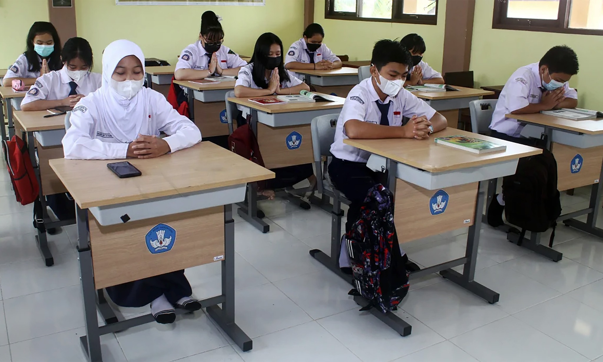 Sejumlah siswa berdoa menurut agama dan kepercayaan masing-masing, sebelum memulai pelajaran di Sekolah Menengah Pertama Negeri (SMPN) 19 di Singkawang, Kalimantan Barat, Selasa (11/1/2022). Antara Foto/Jessica Helena Wuysang