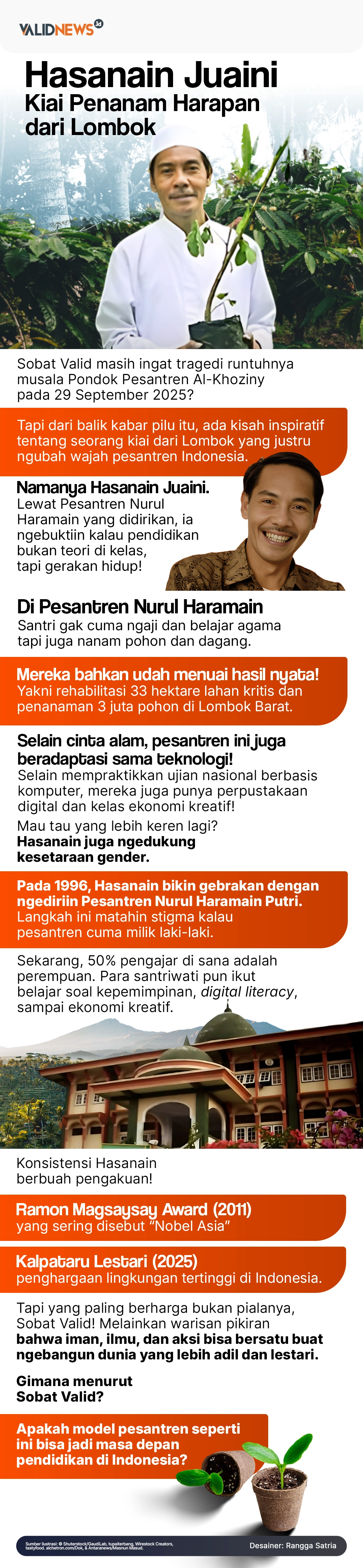 Di Pulau Lombok, nama Hasanain Juaini dikenal sebagai simbol pesantren progresif yang menautkan pendidikan agama dengan kepedulian lingkungan. Di bawah kepemimpinannya, Pondok Pesantren Nurul Haramain Narmada tumbuh sejak dekade 1990-an bukan hanya sebagai tempat menimba ilmu, tetapi juga sebagai pusat gerakan sosial-ekologis.
