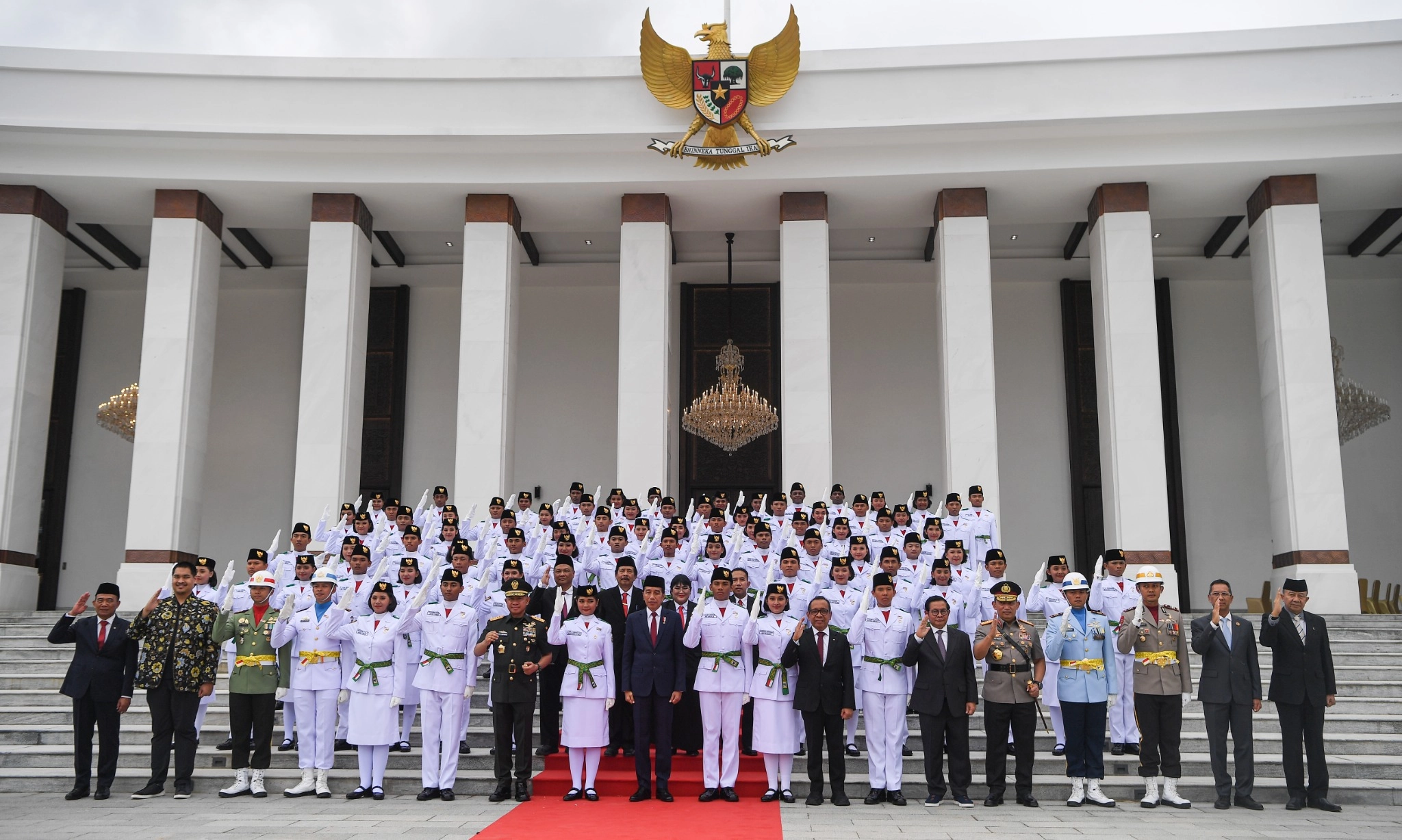 Presiden Joko Widodo didampingi sejumlah menteri dan kepala lembaga negara berfoto bersama anggota P askibraka 2024 seusai dikukuhkan di Istana Negara, Ibu Kota Nusantara (IKN), Kalimantan Timur, Selasa (13/8/2024). Antara Foto/Sigid Kurniawan
