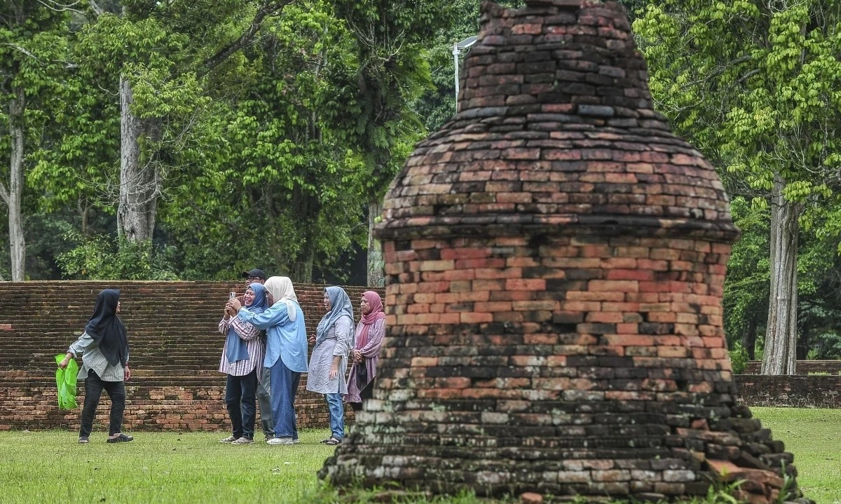 Sejumlah wisatawan mengunjungi Candi Tinggi dalam Kawasan Cagar Budaya Nasional (KCBN) Muarajambi di Muaro Jambi, Jambi, Kamis (26/12/2024).ANTARA FOTO/Wahdi Septiawan.