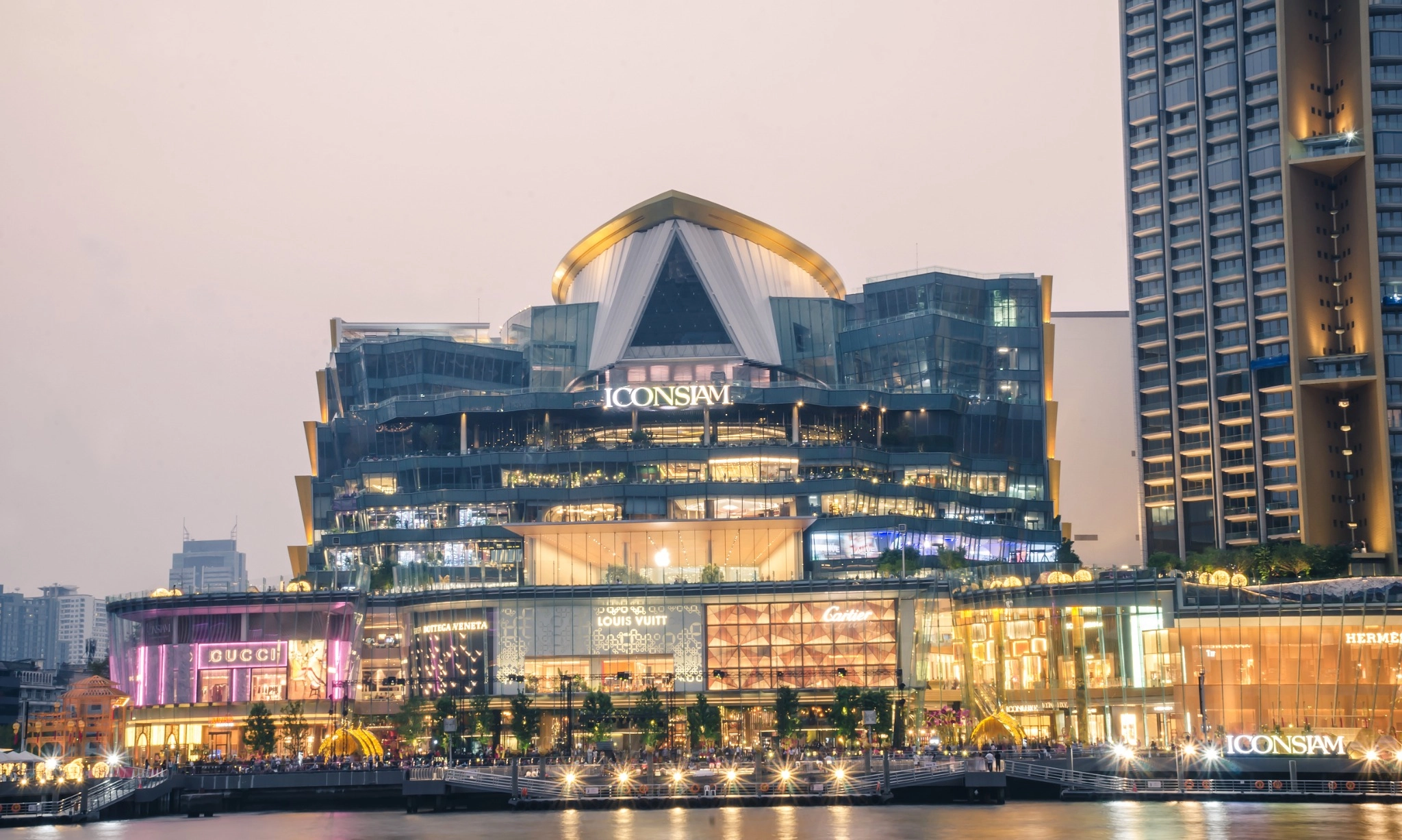 Tampak luar Iconsiam di tepi sungai. ICON SIAM adalah pusat perbelanjaan dan landmark baru Bangkok di malam hari. Shutterstock/tetesong. Pratunam Market
