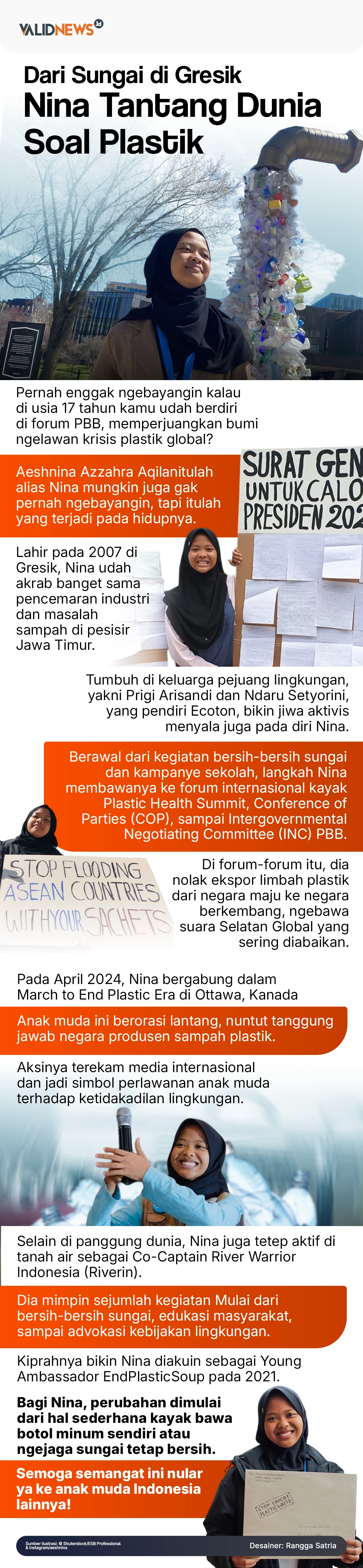 Aeshnina Azzahra Aqilani menjadi bukti bahwa satu suara muda mampu mengguncang percakapan global tentang keadilan lingkungan. Dari kota kecil Gresik, ia membawa pesan besar hingga ke Ottawa dan berbagai forum internasional, menuntut dunia agar lebih bertanggung jawab terhadap krisis plastik. Keberanian dan konsistensinya menjadikan Nina bukan sekadar simbol, melainkan penggerak nyata yang menginspirasi teman-teman sebayanya untuk turun tangan menjaga bumi, mulai dari ruang kelas hingga sungai di kampung halaman.