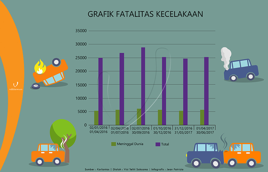 Validnews merangkum data “Laporan kecelakaan berdasarkan Polda” yang dikeluarkan Korlantas Polri. Dari data tersebut diketahui bahwa angka kecelakaan tertinggi se-Indonesia berada di wilayah Jawa Timur dengan jumlah kecelakaan sebanyak 6.328 kejadian. Disusul pada posisi kedua yakni Jawa Tengah dengan jumlah kecelakaan sebanyak 4.420 kejadian.