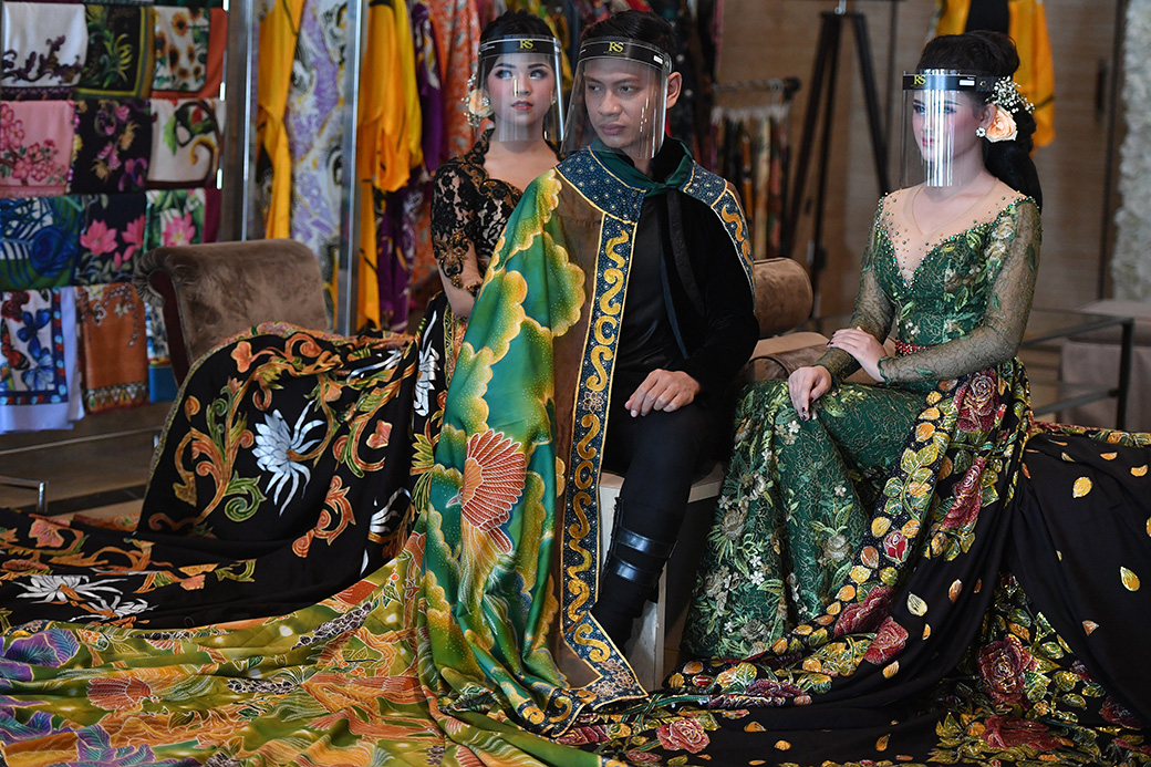 Model dengan mengenakan pelindung wajah melakukan peragaan busana pengantin tradisional bermotif batik karya Eko Tjandra di Surabaya, Jawa Timur, Kamis (6/8/2020). Peragaan busana tersebut dalam rangka mempromosikan batik nusantara. ANTARAFOTO/Zabur Karuru.