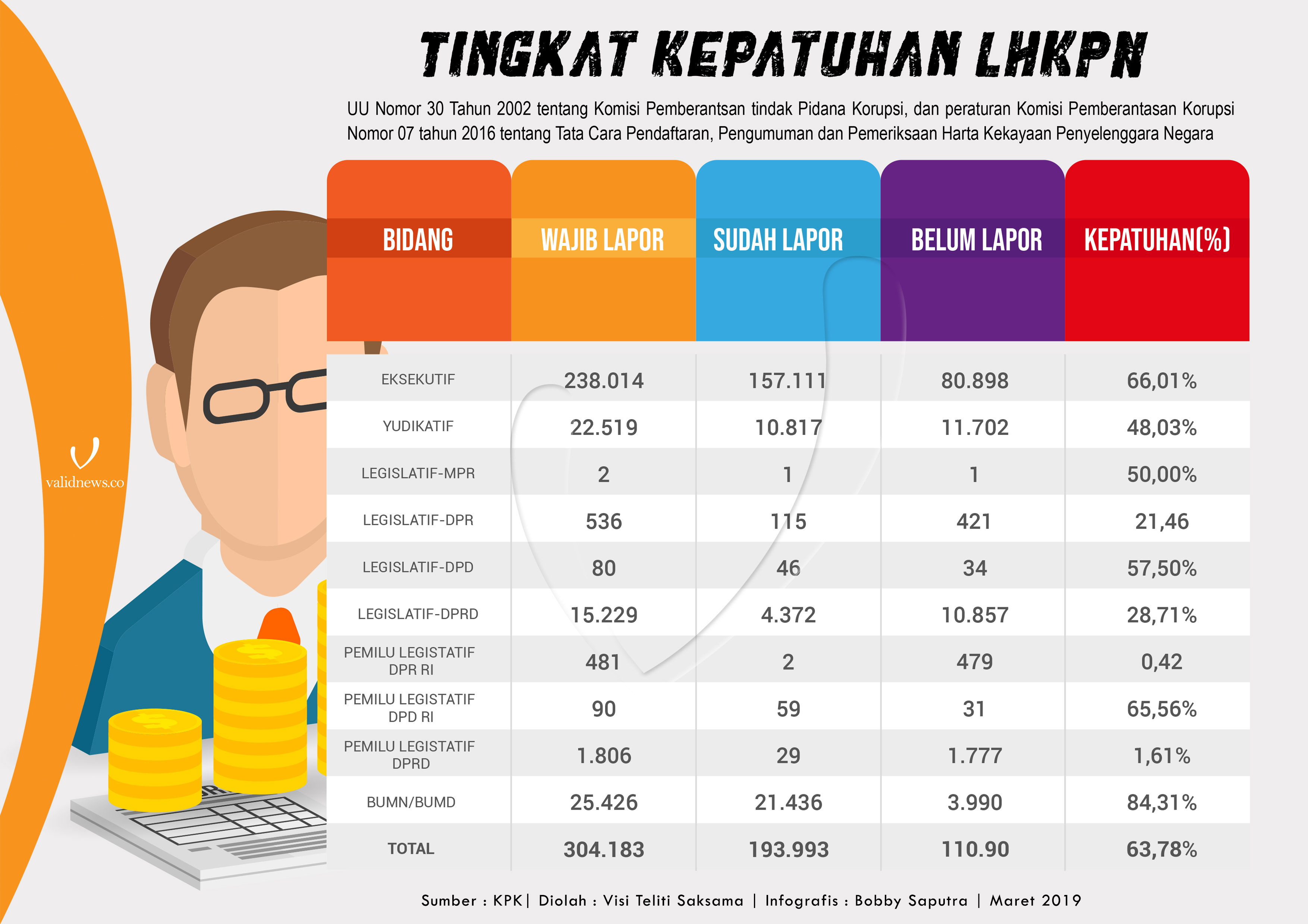 Sebelumnya, KPK bersama KPU telah mengumumkan secara resmi nama anggota DPR, DPD, dan DPRD yang telah melaporkan secara LHKPN, baik yang tepat waktu, terlambat, dan belum melaporkan sama sekali. Untuk waktu pelaporan periode 2018 dilaporkan pada rentang waktu 1 Januari sampai 31 Maret 2019. (Dana Pratiwi)