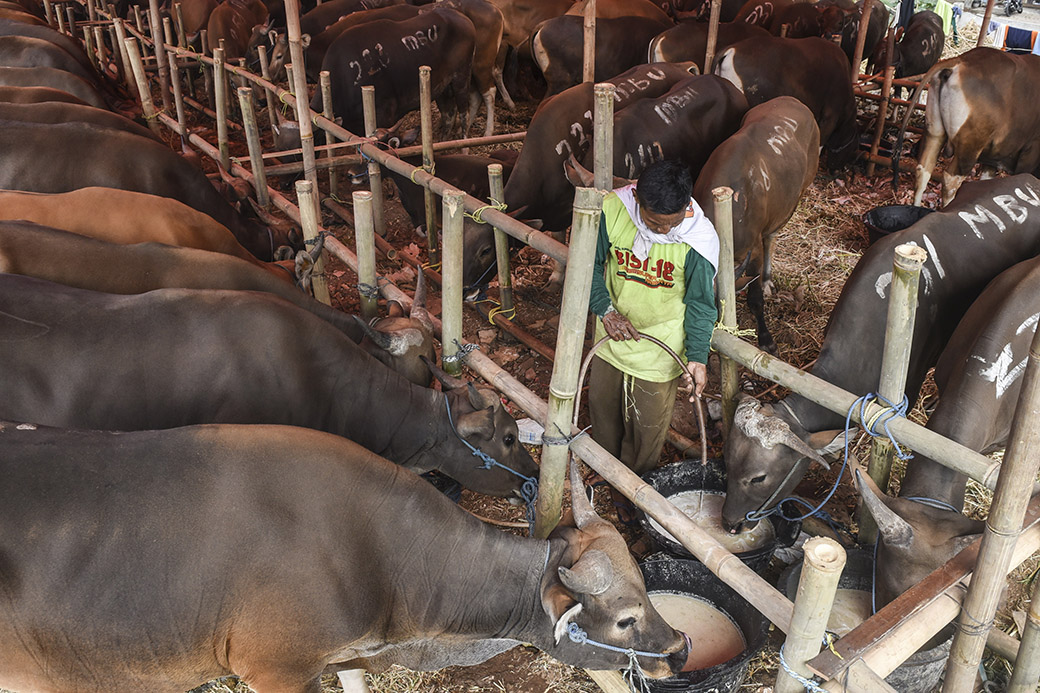 Penjual hewan kurban memberi makan sapi dagangannya di Jakarta, Rabu (10/7/2019). ANTARAFOTO/Muhammad Adimaja.