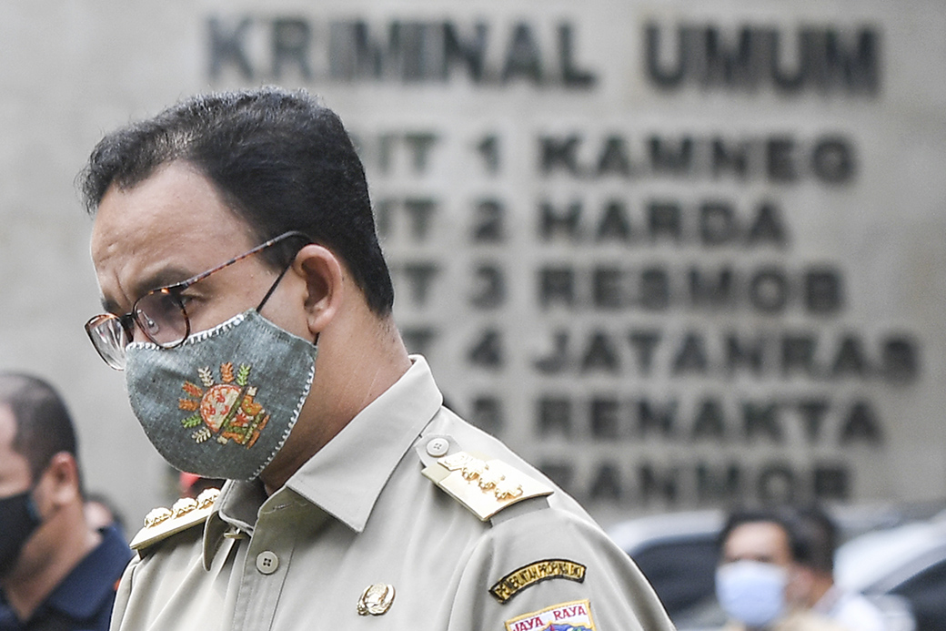 Gubernur DKI Jakarta Anies Baswedan tiba di Mapolda Metro Jaya, Jakarta, Selasa (17/11/2020). Gubernur DKI Jakarta Anies Baswedan dipanggil pihak kepolisian untuk dimintai keterangan terkait pelanggaran protokol kesehatan pada acara Maulid Nabi di Petamburan, Jakarta Pusat yang menimbulkan kerumunan. ANTARAFOTO/Hafidz Mubarak A