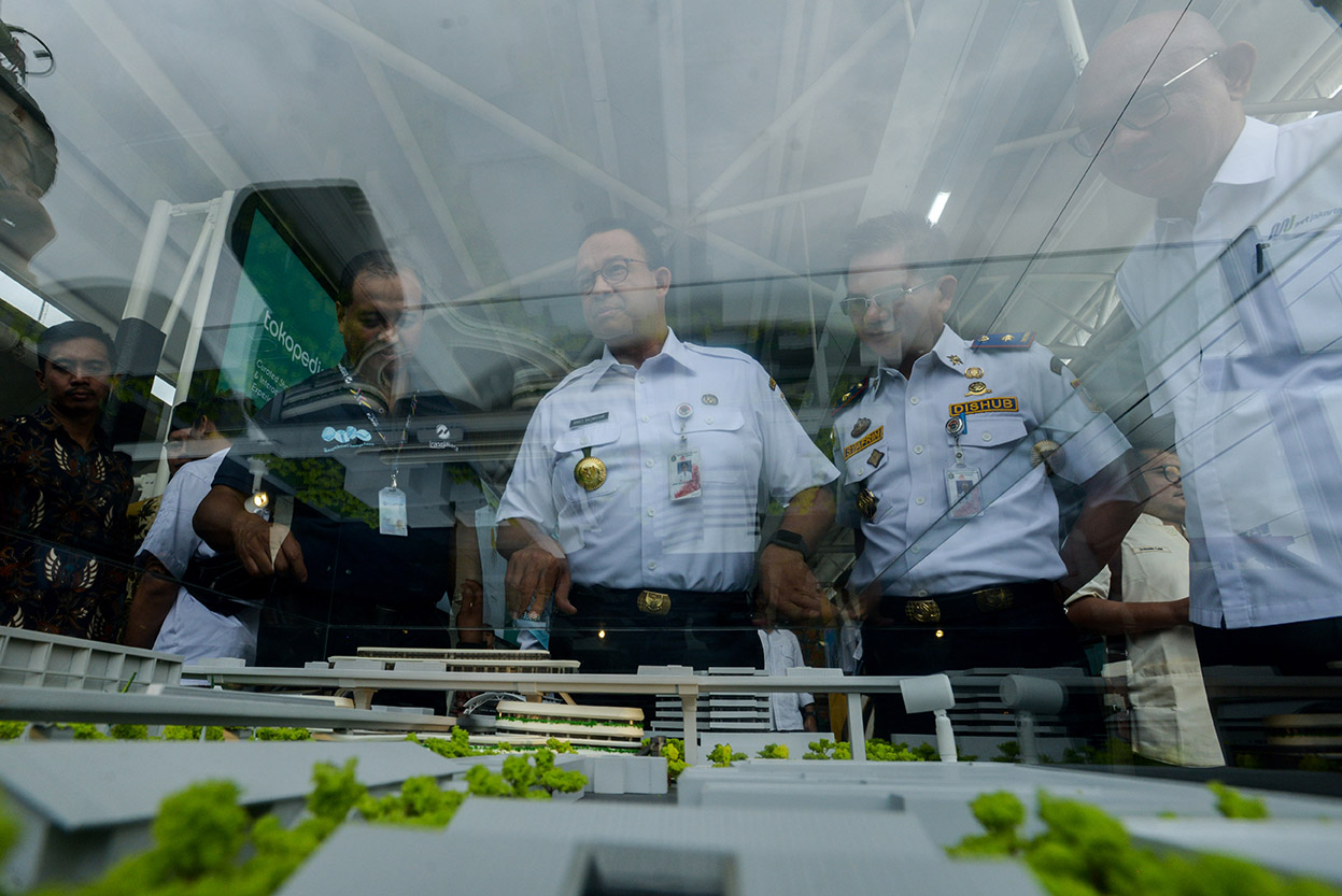 Gubernur DKI Jakarta Anies Baswedan (kedua kiri) didampingi Dirut PT Transjakarta Agung Wicaksono (kiri), Kepala Dinas Perhubungan DKI Jakarta Syafrin Liputo (kedua kanan) dan Dirut PT MRT Jakarta William Sabandar (kanan) melihat maket jembatan layang di Stasiun MRT ASEAN, Jakarta, Rabu (22/1/2020). Pembangunan jembatan layang tersebut untuk mengintegrasikan Stasiun MRT ASEAN dengan Halte Transjakarta CSW. ANTARAFOTO/Rivan Awal Lingga.