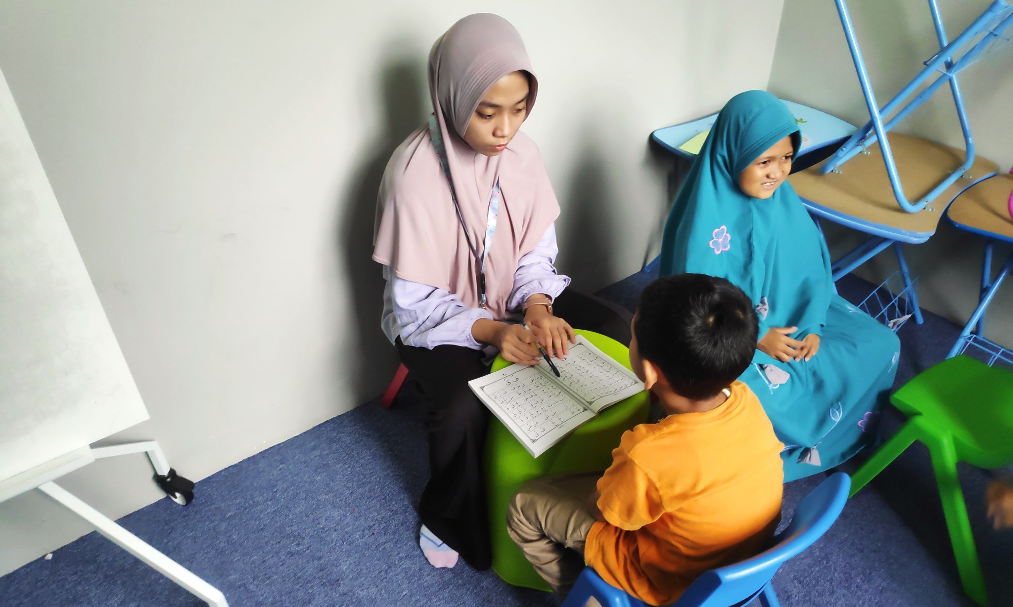 Guru sedang mengajari membaca Al Qu'ran di Ibtisamah Mulia, Jatiluhur, Kota Bekasi. ValidNewsID/Muhammad Farhan Adhantyo Metode bahasa isyarat, kata Basiimah, juga berguna buat orang tua siswa. Sebab selama ini dia banyak mendapati orang tua siswa yang belum memahami bahasa isyarat.