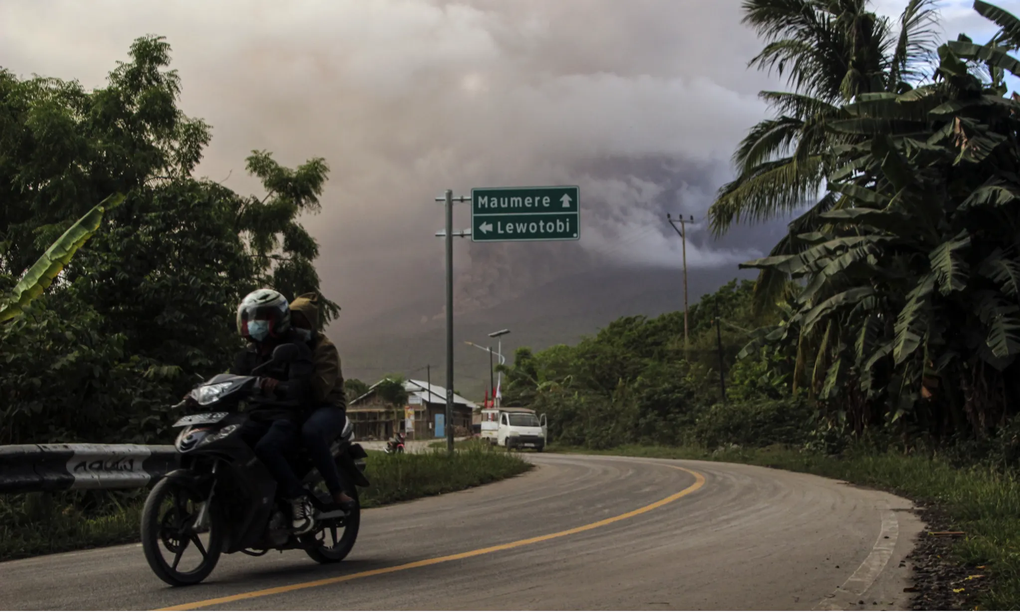 Pengendara motor melintas dengan berlatar belakang Gunung Lewotobi Laki-laki yang erupsi di Desa Nobo, Ile Bura, Flores Timur, NTT, Rabu (10/1/2024). Antara Foto/Mega Tokan