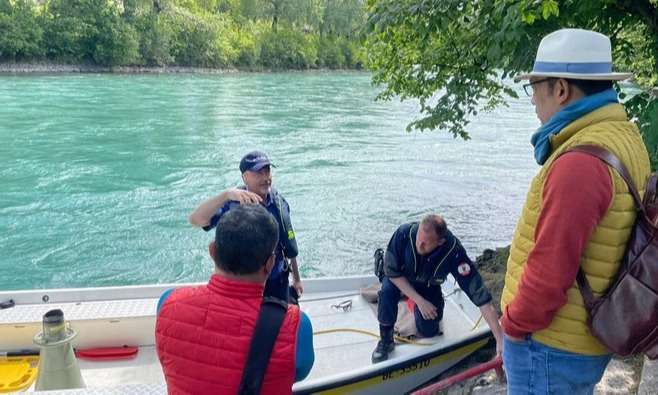 | Ridwan Kamil memantau pencarian Eril yang hilang di Sungai Aare, Swiss. KBRI Bern/Dok |