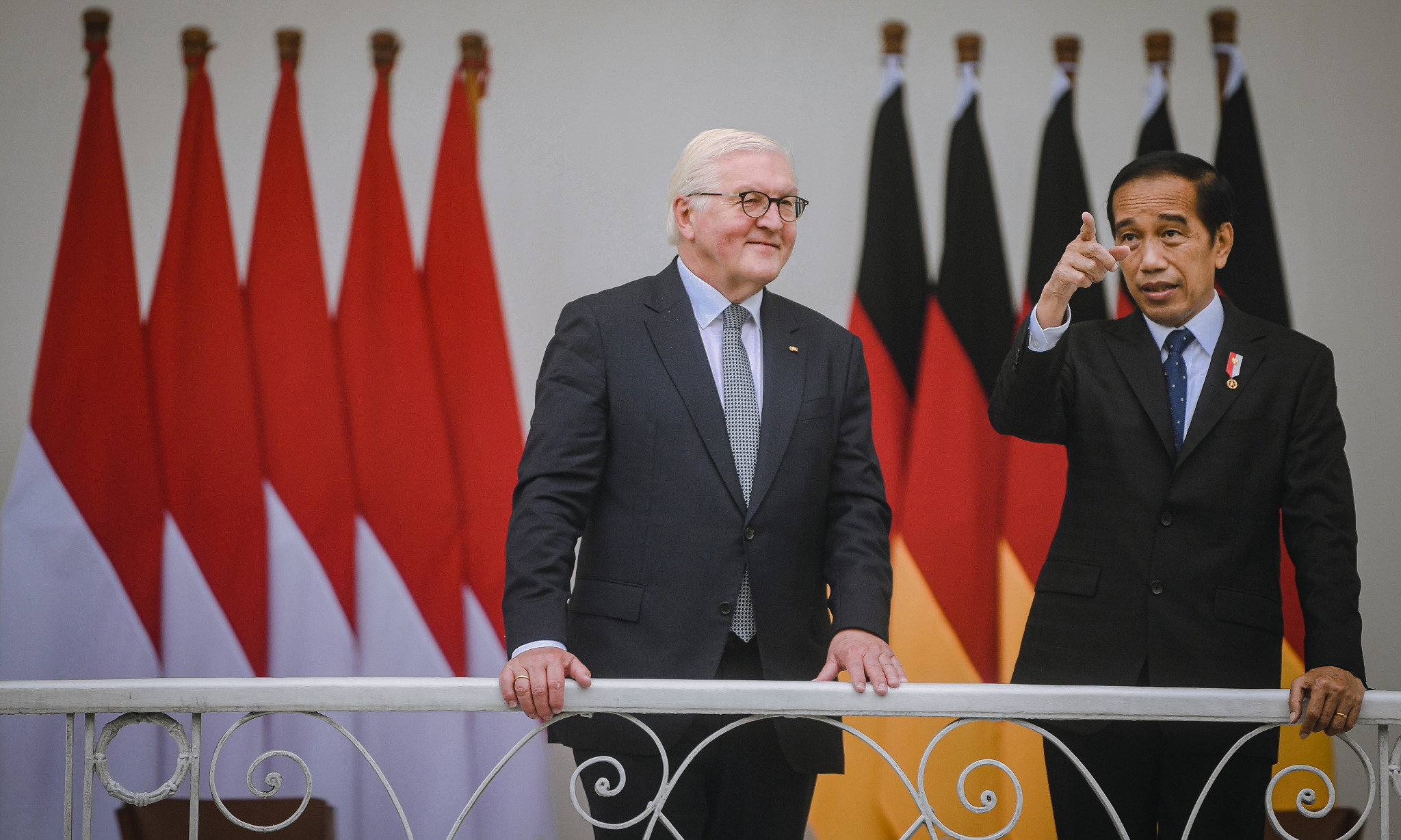 Presiden Joko Widodo berbincang dengan Presiden Republik Federal Jerman Frank-Walter Steinmeier (kiri) di Istana Bogor, Jawa Barat, Kamis (16/6/2022). ANTARA FOTO/Akbar Nugroho Gumay